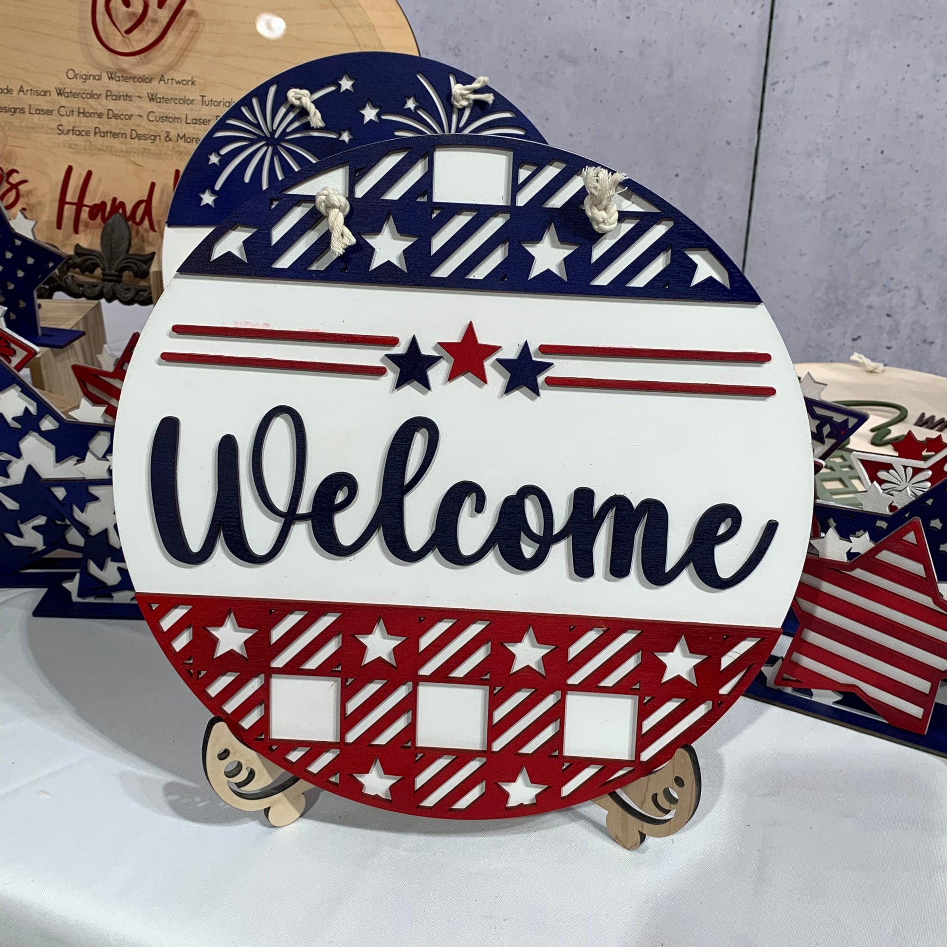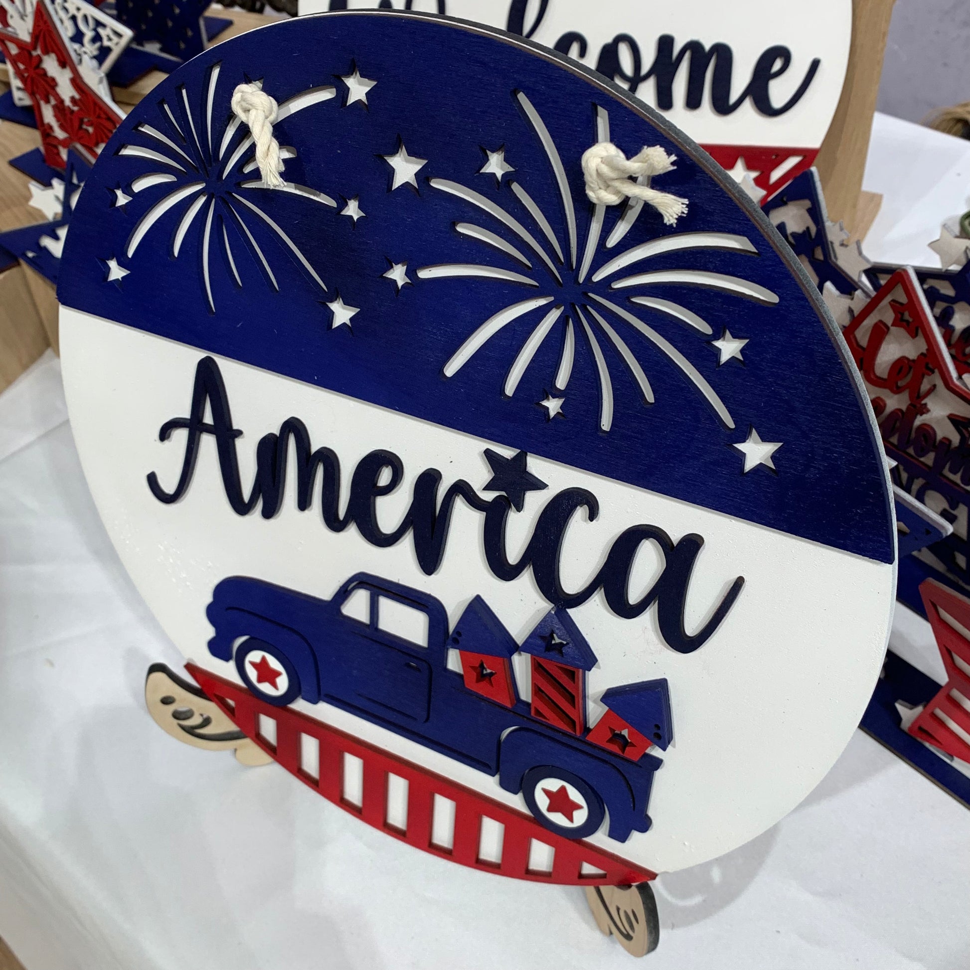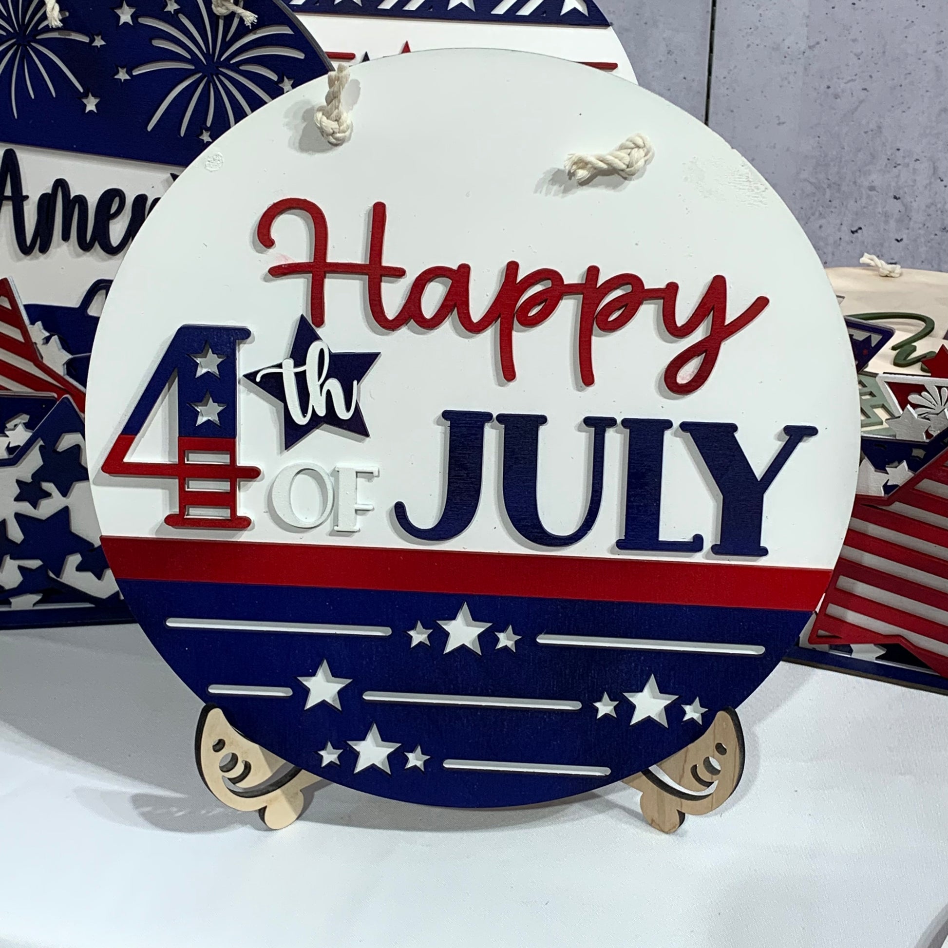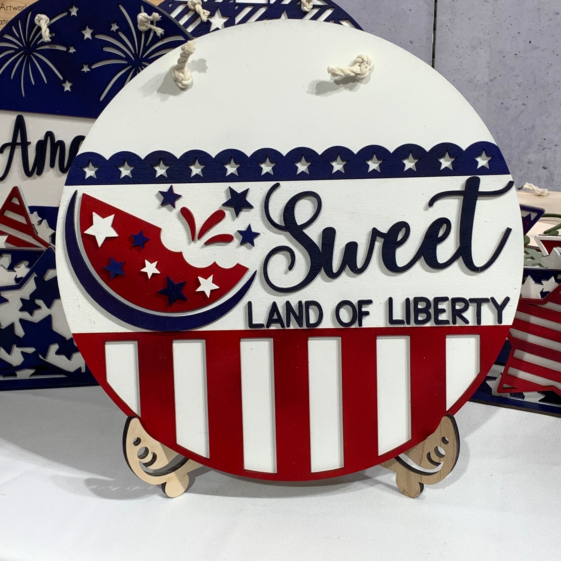 12 inch round sign. Back is cut from 1/4” maple veneer plywood and is left natural. The layered pieces are laser cut from 1/8” Baltic birch plywood and painted in acrylic paint in shades of red, white and blue. Natural colored cotton cording for hanger.