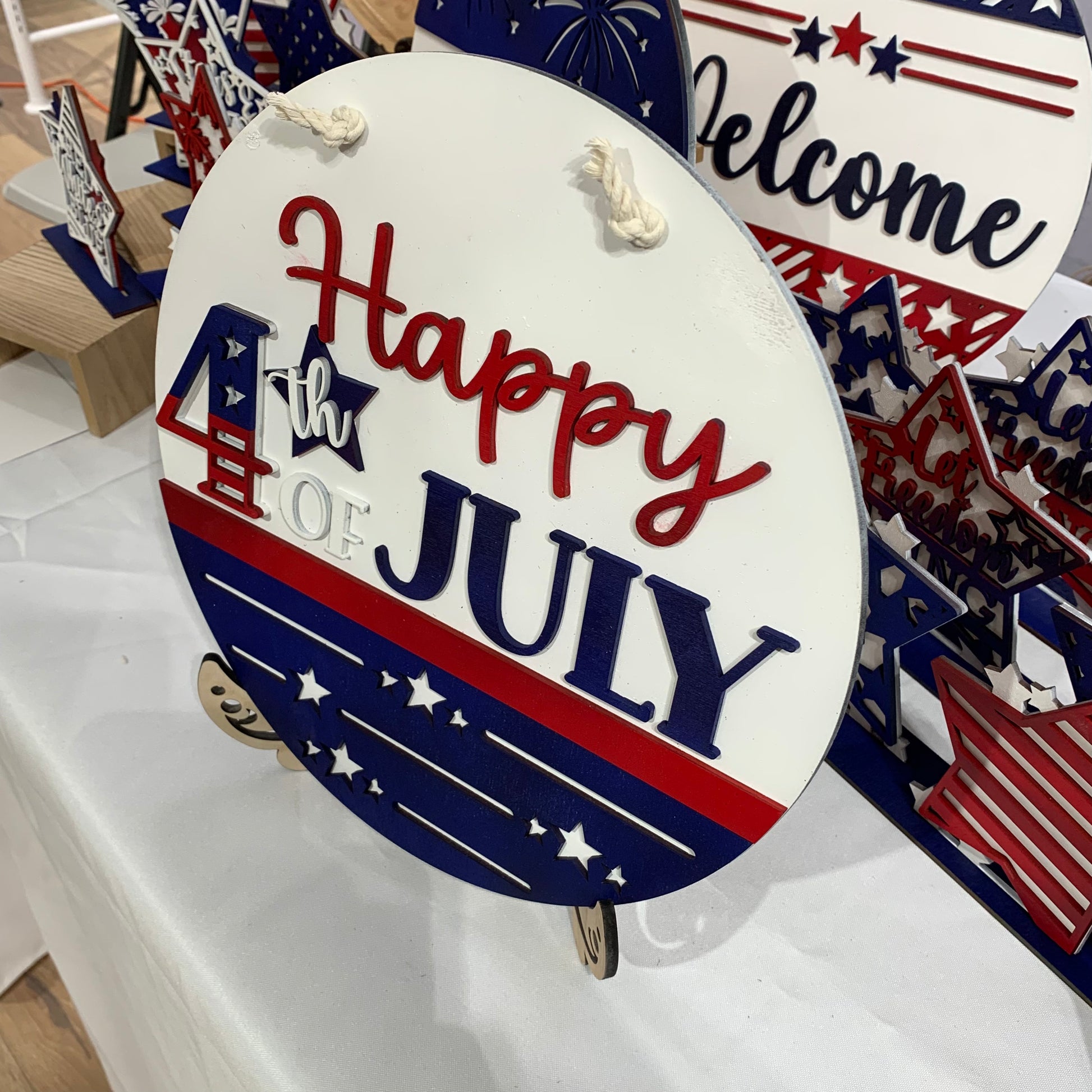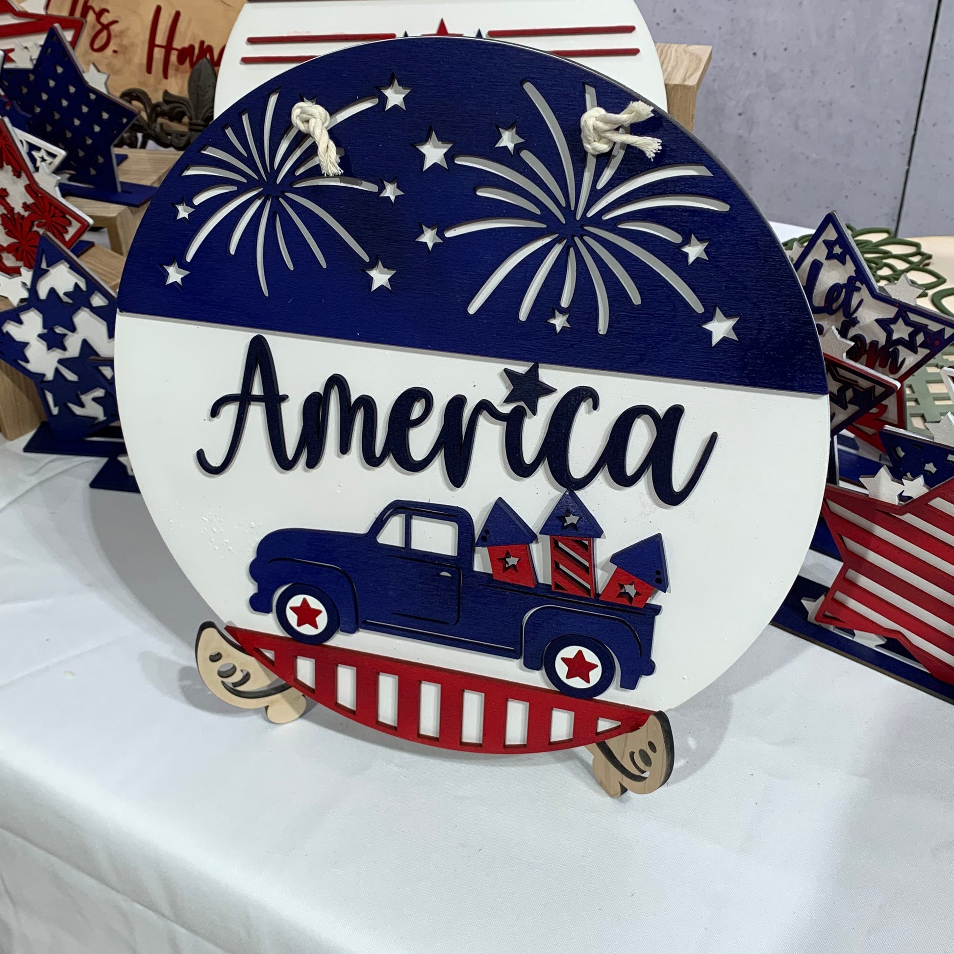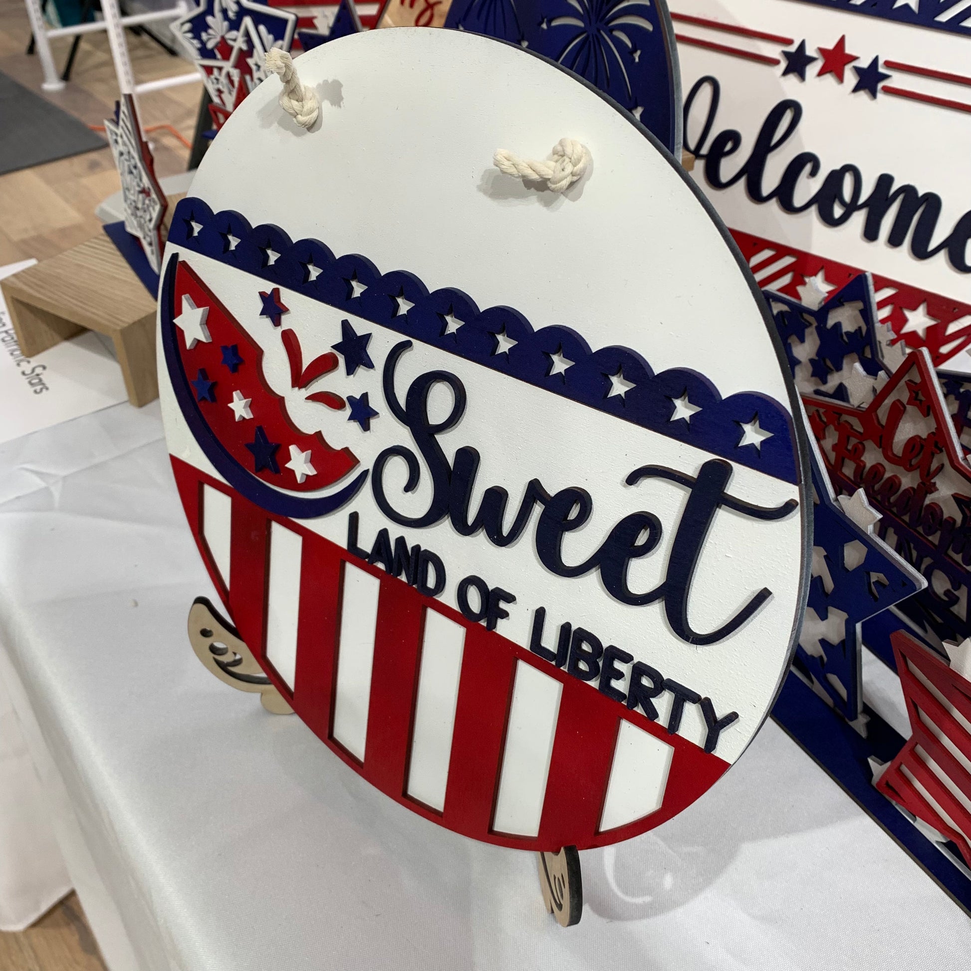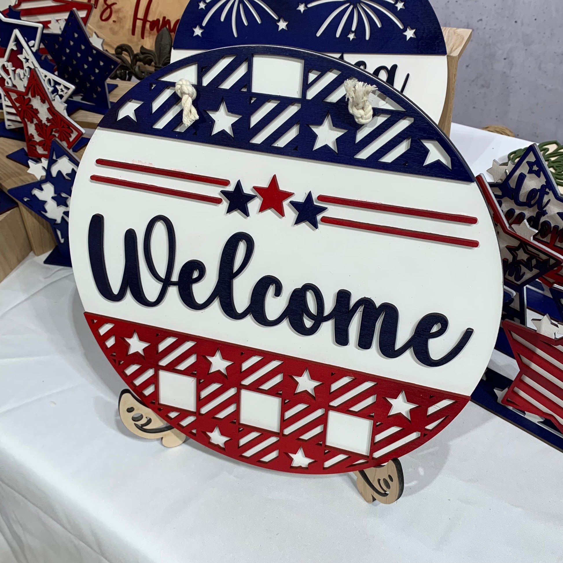 12 inch round sign. Back is cut from 1/4” maple veneer plywood and is left natural. The layered pieces are laser cut from 1/8” Baltic birch plywood and painted in acrylic paint in shades of red, white and blue. Natural colored cotton cording for hanger.
