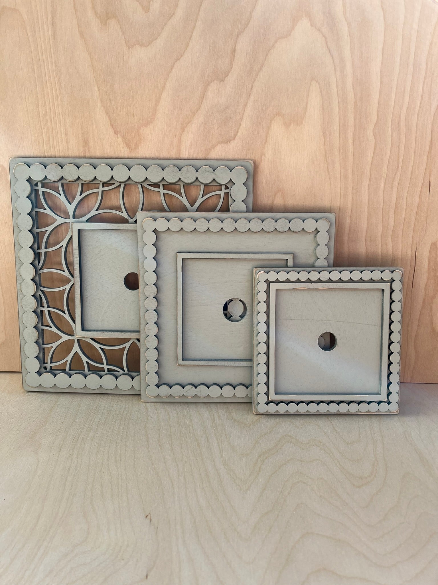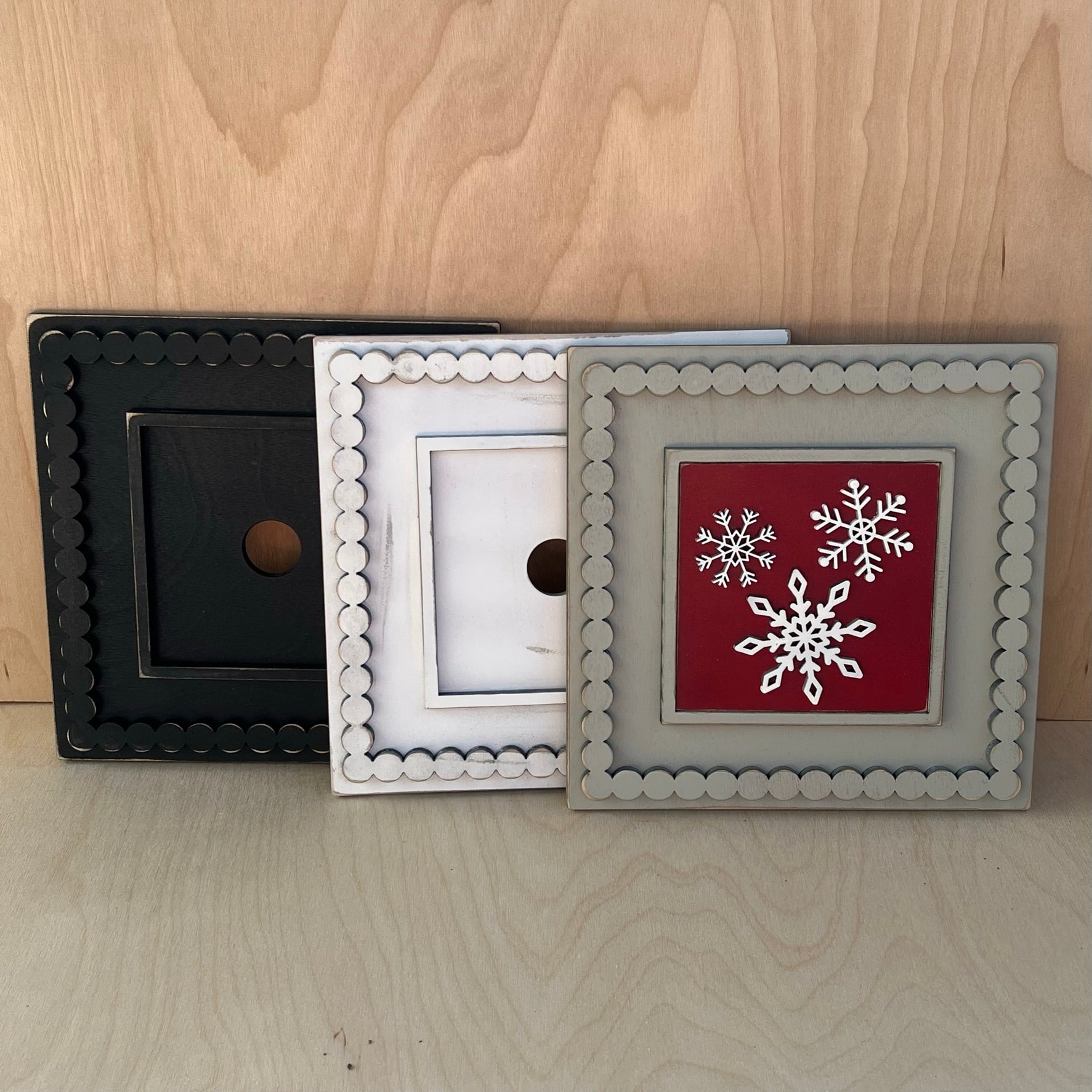 This faux beaded trim laser cut sign holder will compliment your interchangeable sign tiles for every season! Each sign tile holder can hold 1 individual sign tile - the opening fits perfectly for the 4.25 inch sign tiles in my shop. There is a hole in the back center of each opening to push the tiles out from the back to change them out.