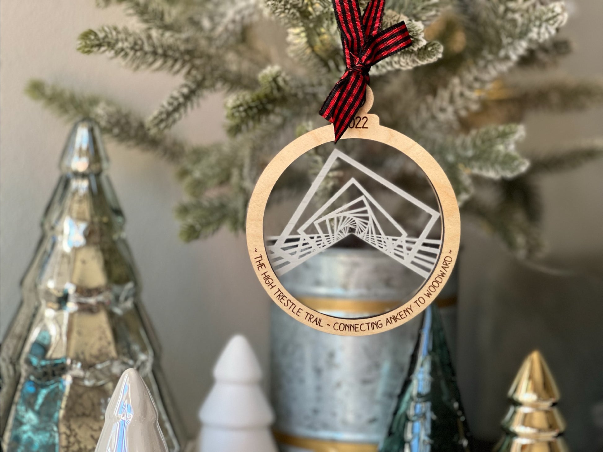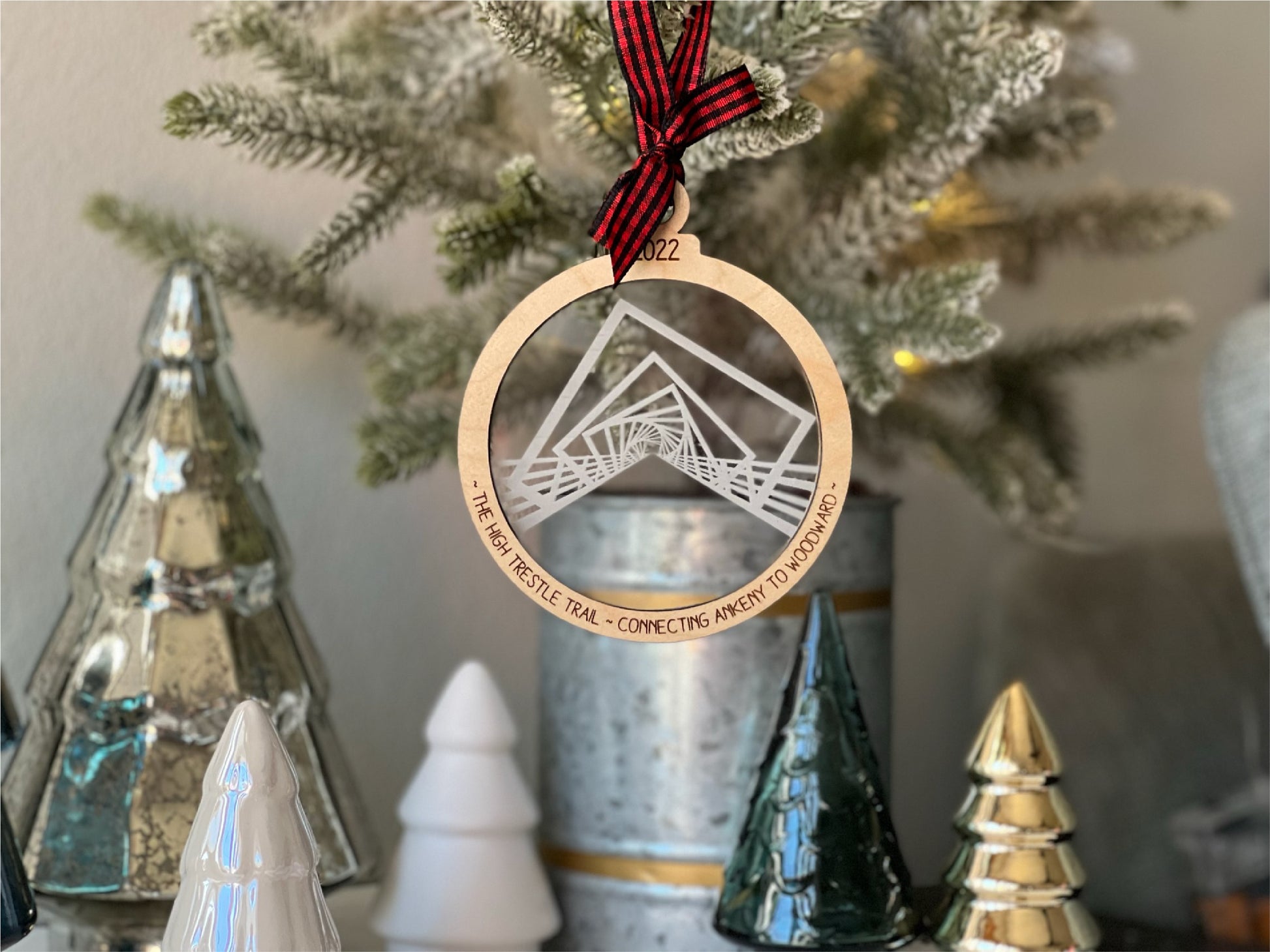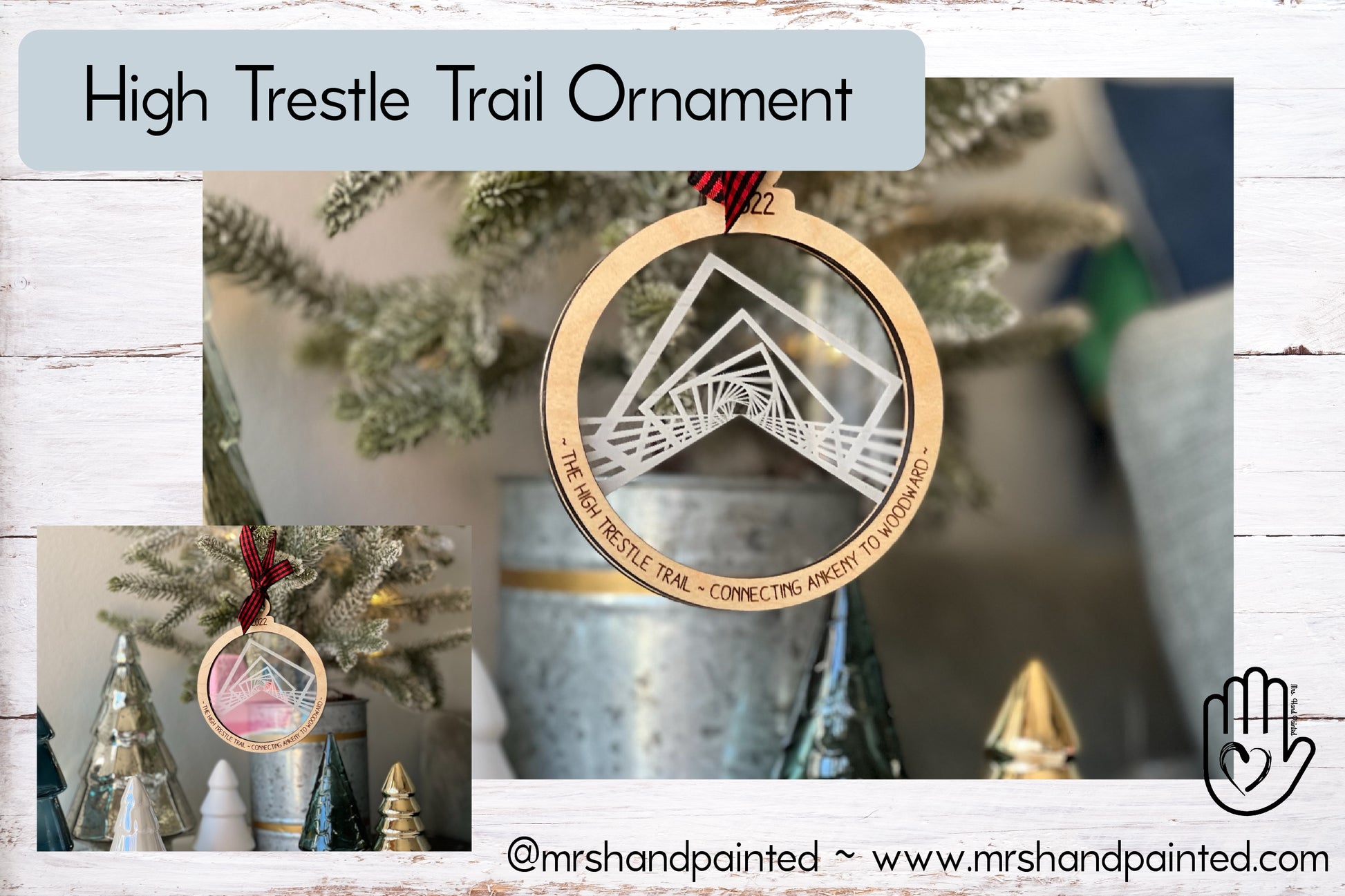 Each ornament is cut out your choice of 1/8" baltic birch or 1/8" cherry hardwood veneer plywood. The Cherry hardwood will have a clear gloss finish and the baltic birch will be sanded and unfinished. The inner layer is made from 1/16" clear acrylic and engraved with the image of the High Trestle Bridge.