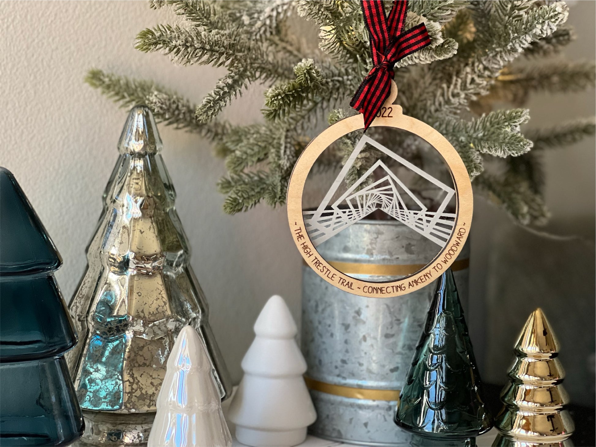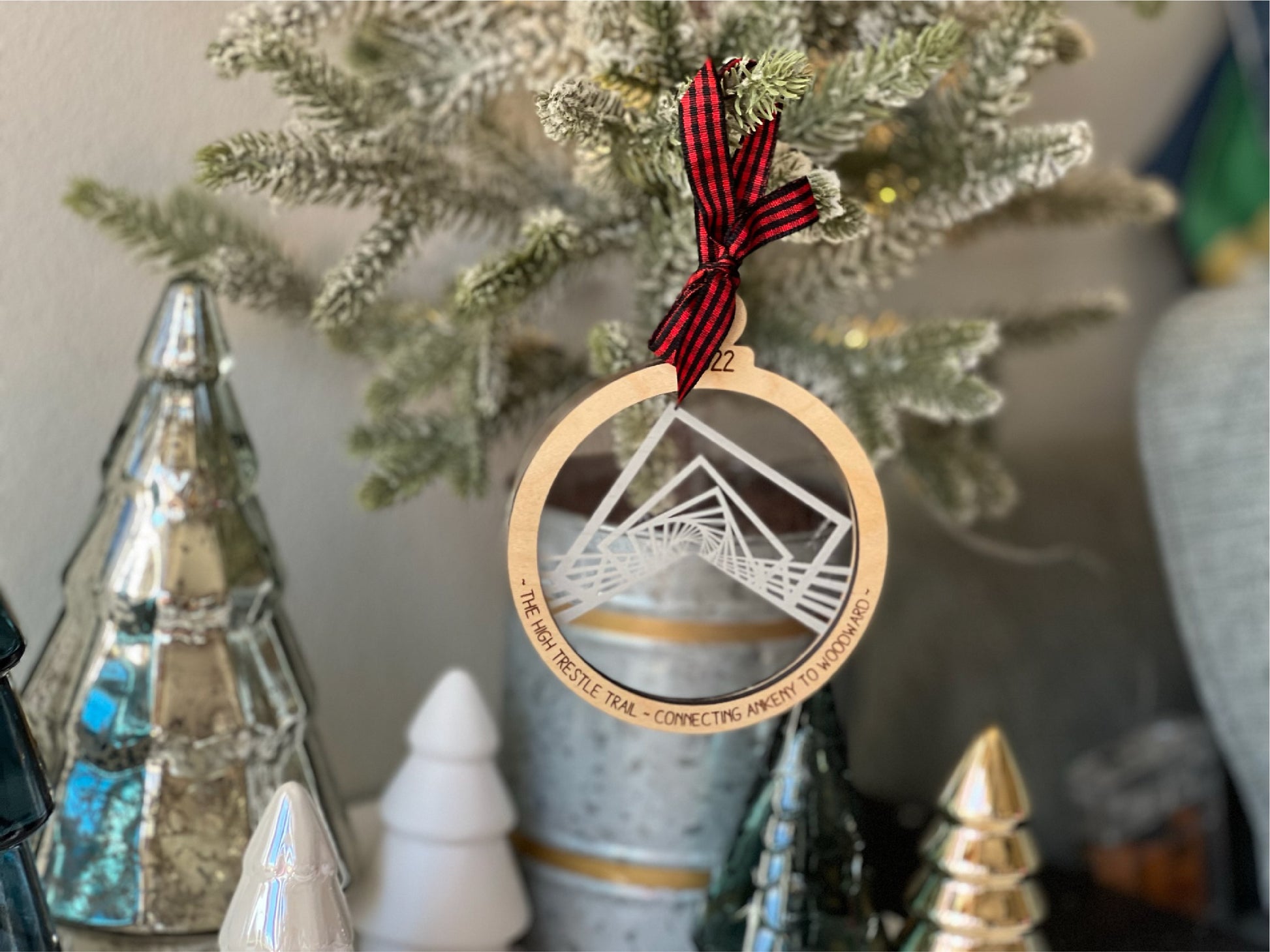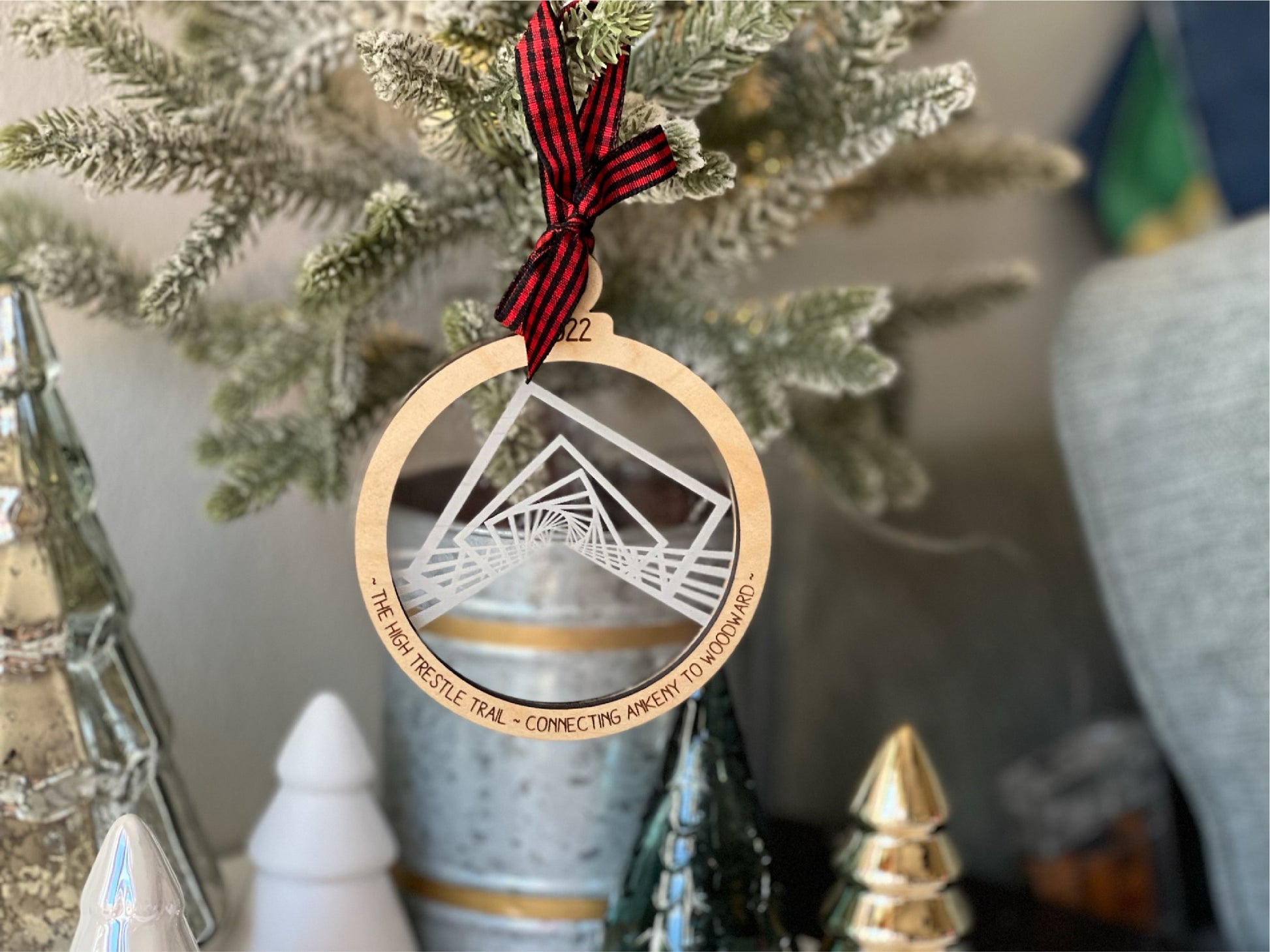 Each ornament is cut out your choice of 1/8" baltic birch or 1/8" cherry hardwood veneer plywood. The Cherry hardwood will have a clear gloss finish and the baltic birch will be sanded and unfinished. The inner layer is made from 1/16" clear acrylic and engraved with the image of the High Trestle Bridge.