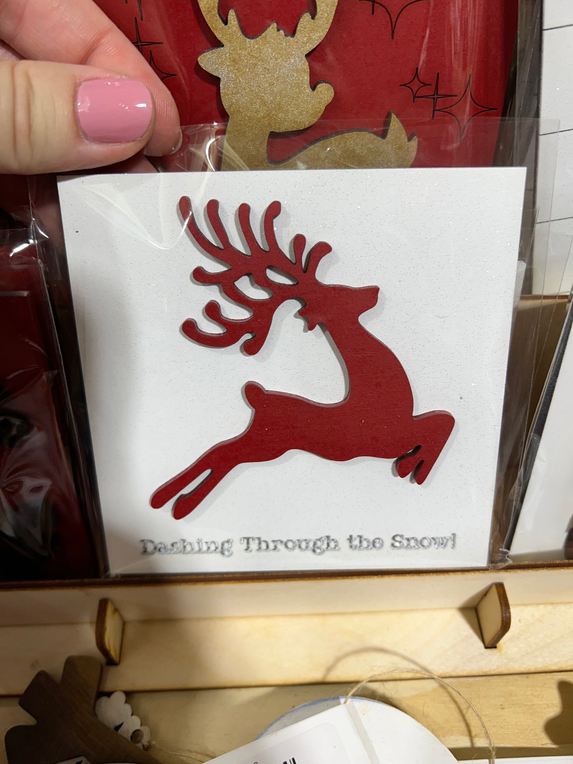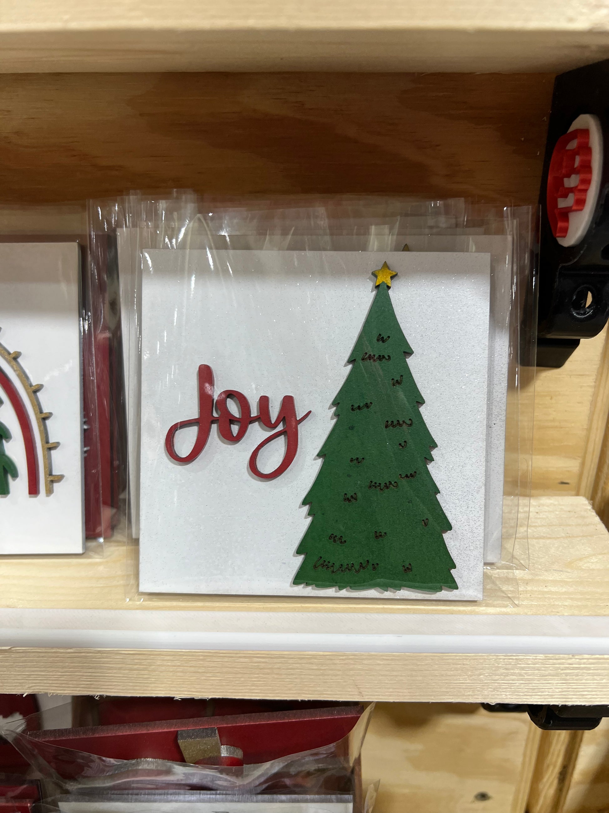 Christmas themed interchangeable sign tiles. Cut on my OmTech laser cutter from 1/8" baltic birch plywood or mdf and hand painted with acrylic paint. Color scheme is white, red, green, light blue and silver.
