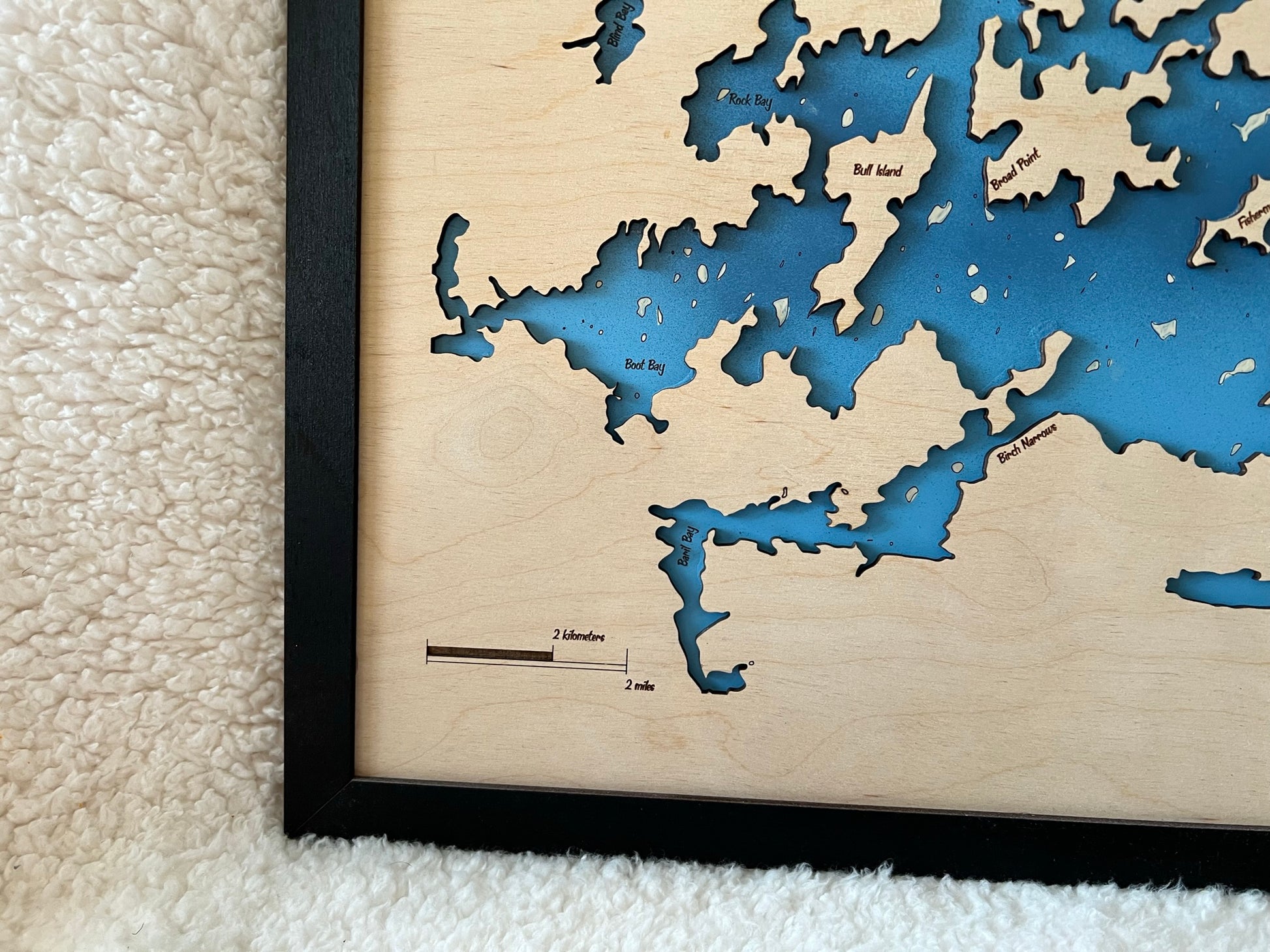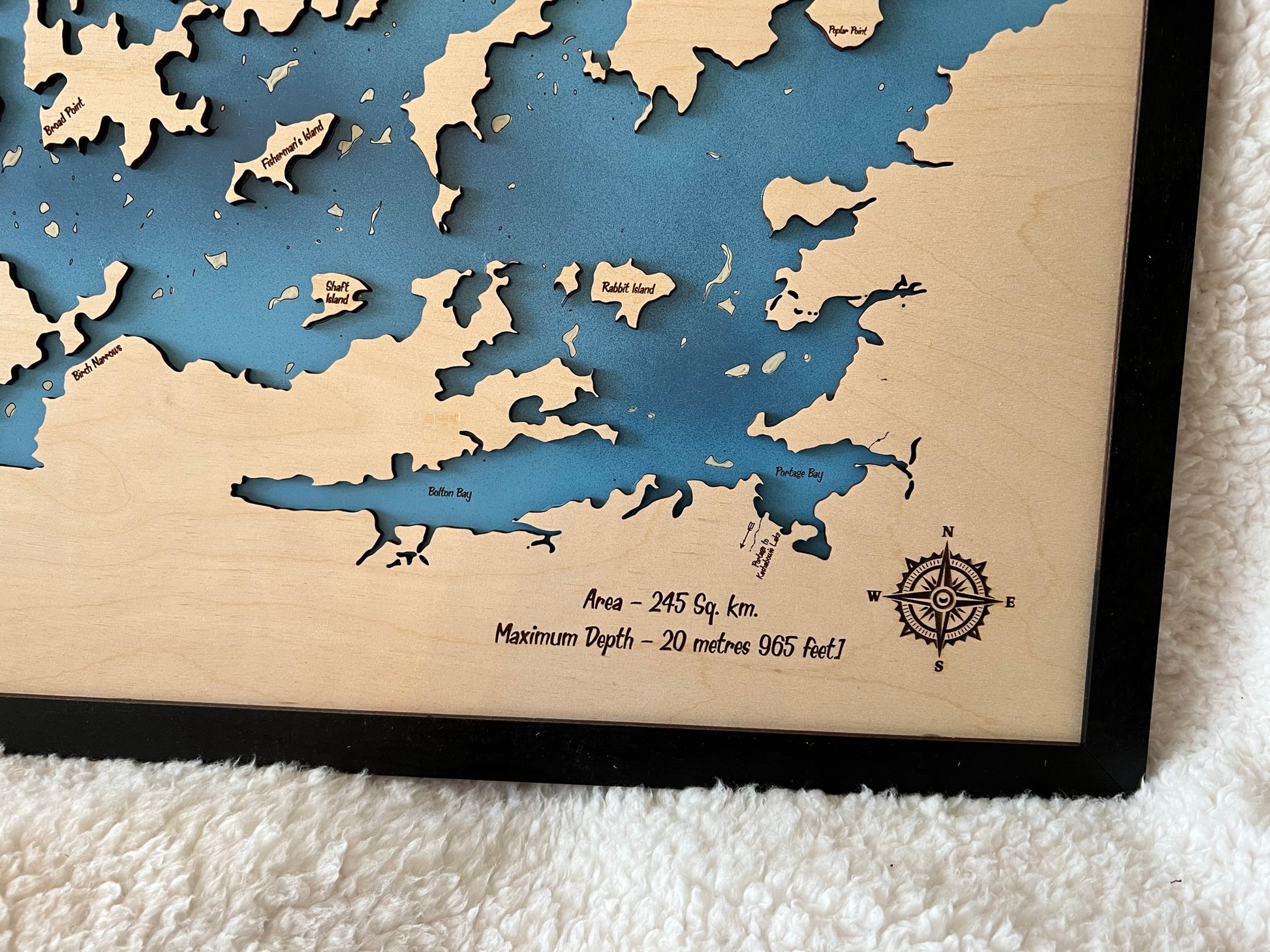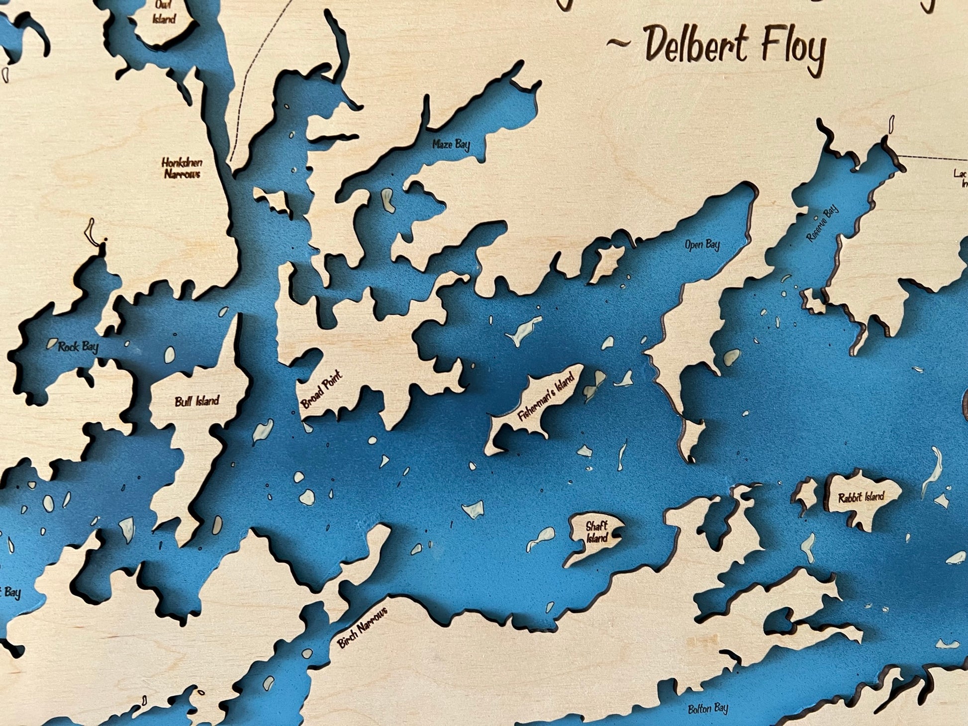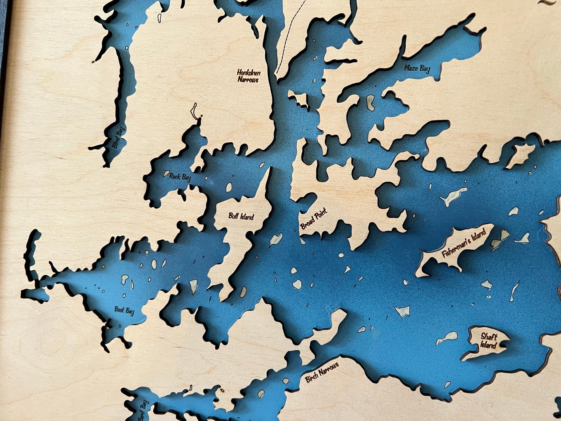 Each map is made of two layers, the lower layer includes bathymetric depth lines when available. The top layer is engraved and cut out to show the boundaries of the lake. Any significantly sized islands are hand glued in place. The piece is finished with a black painted trim.