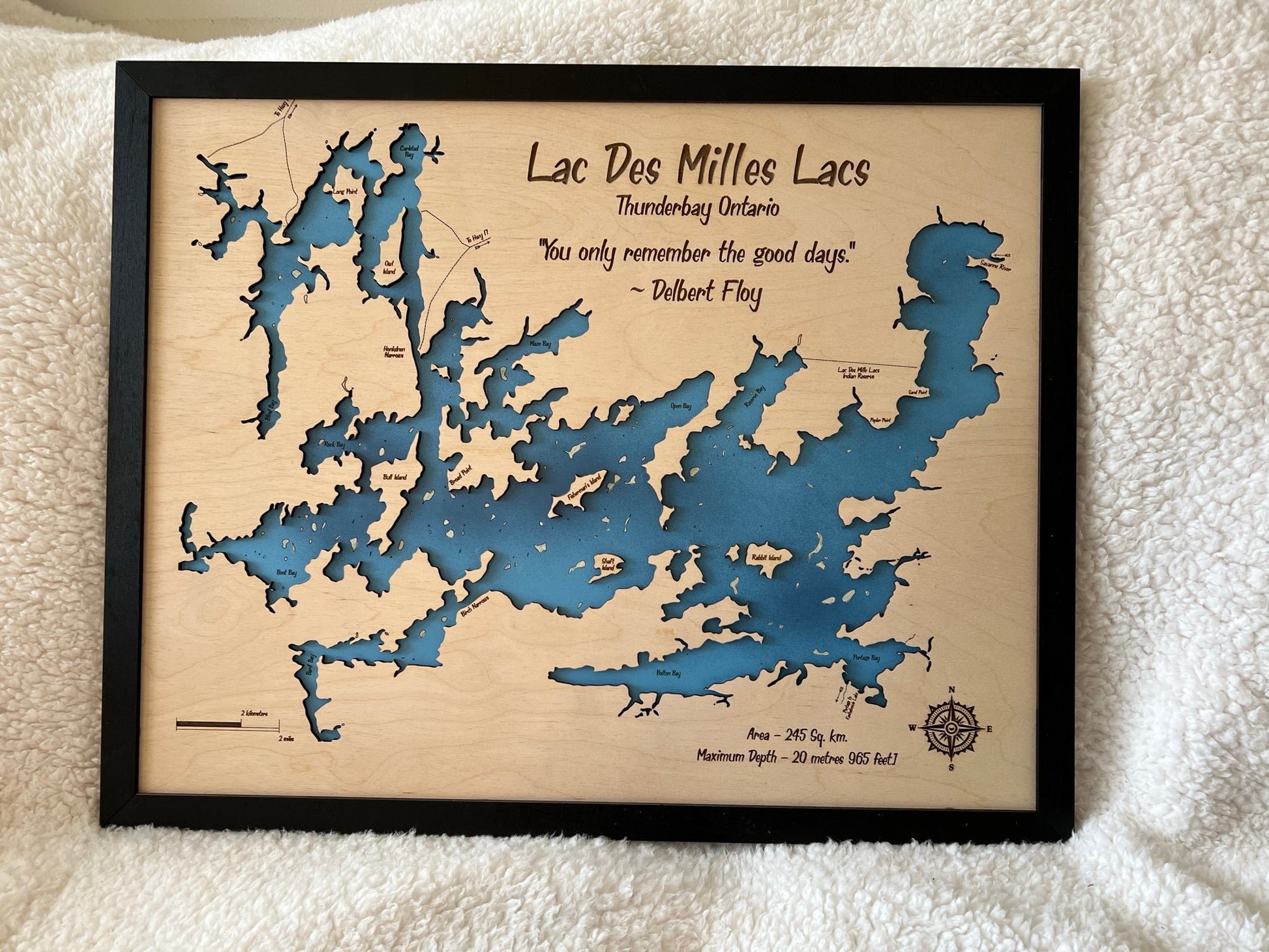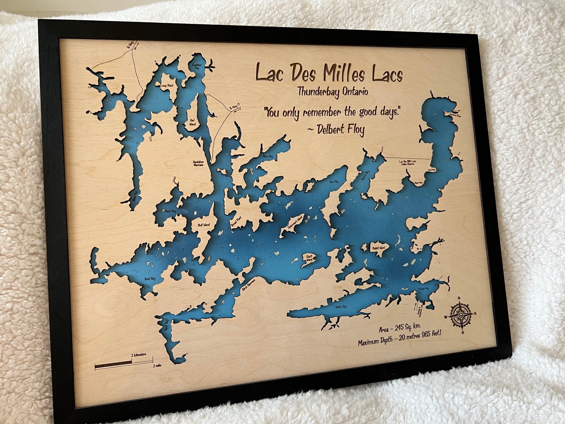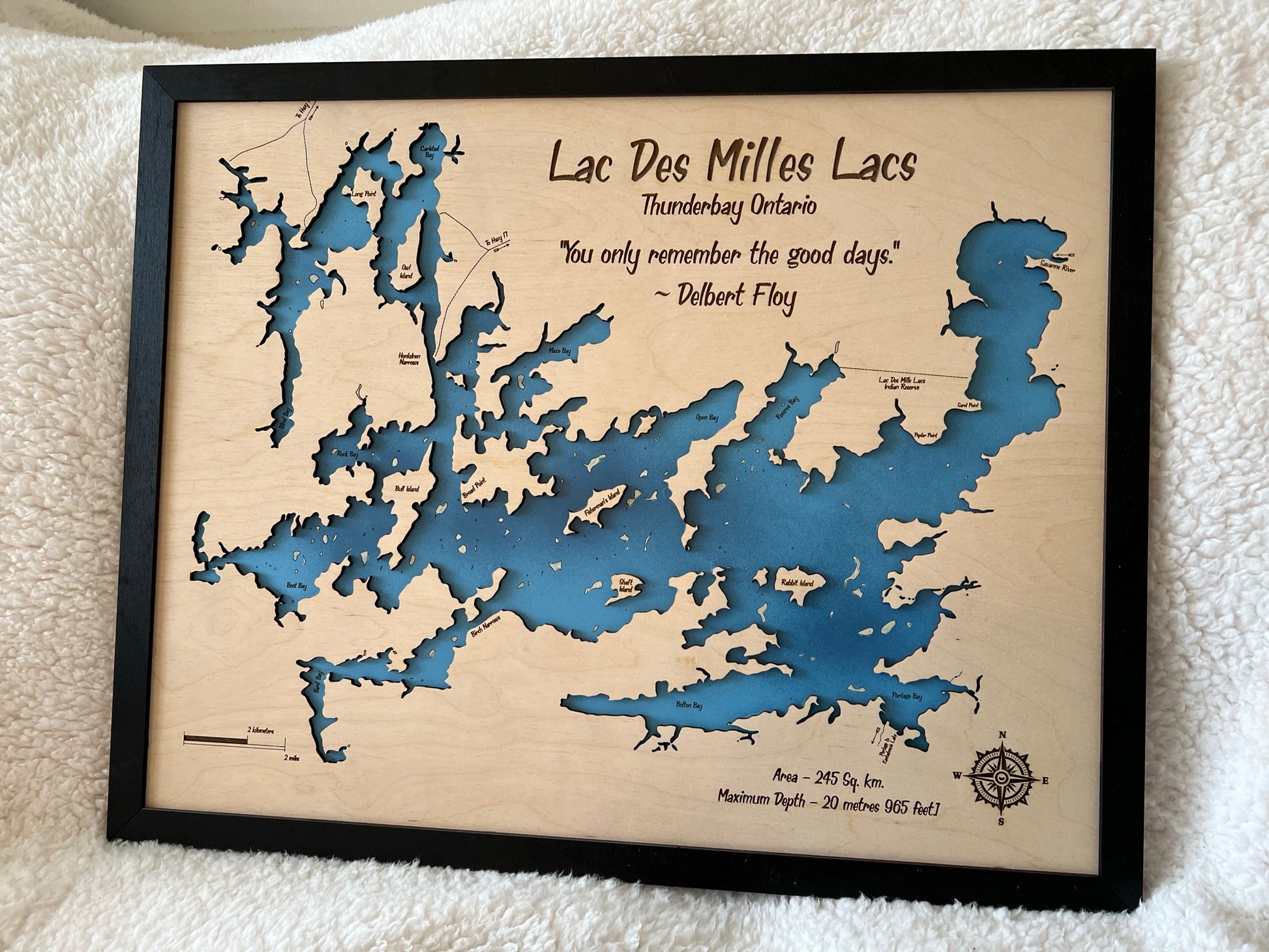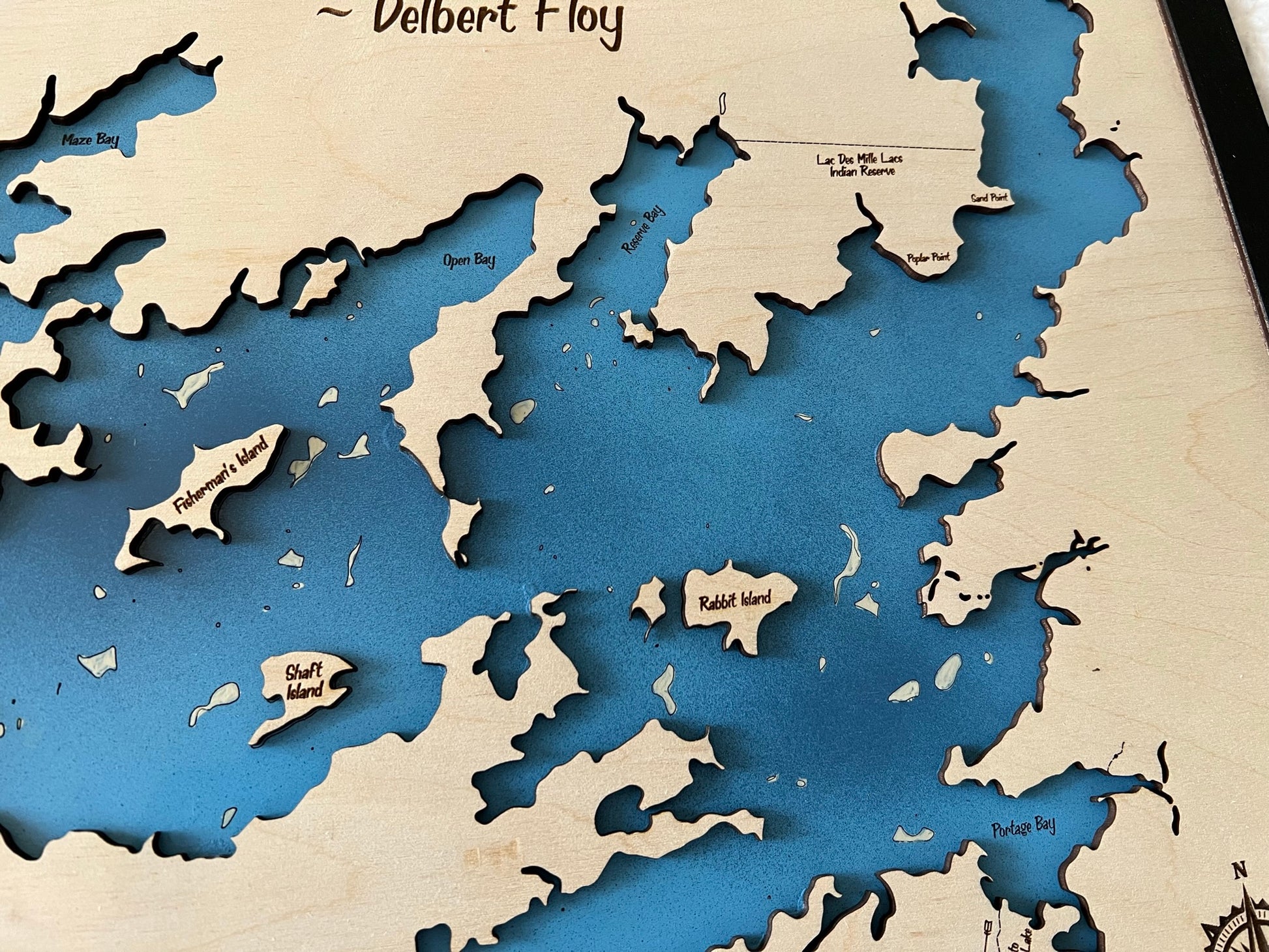 Each map is made of two layers, the lower layer includes bathymetric depth lines when available. The top layer is engraved and cut out to show the boundaries of the lake. Any significantly sized islands are hand glued in place. The piece is finished with a black painted trim.