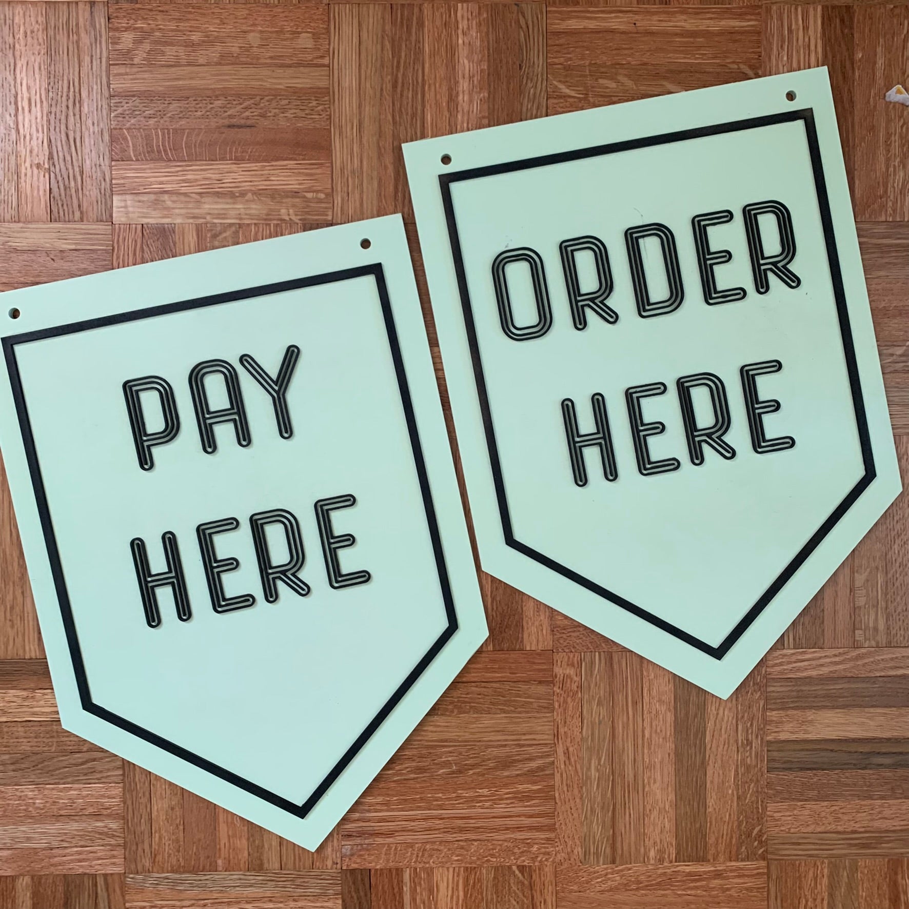 This sign will feature a 1/4" backer in color of your choice. The top layer will be 1/8" plywood painted to match your logo. If you have a smaller text, such as a tagline, this will be engraved directly into the backer of the sign. Please see examples for reference.