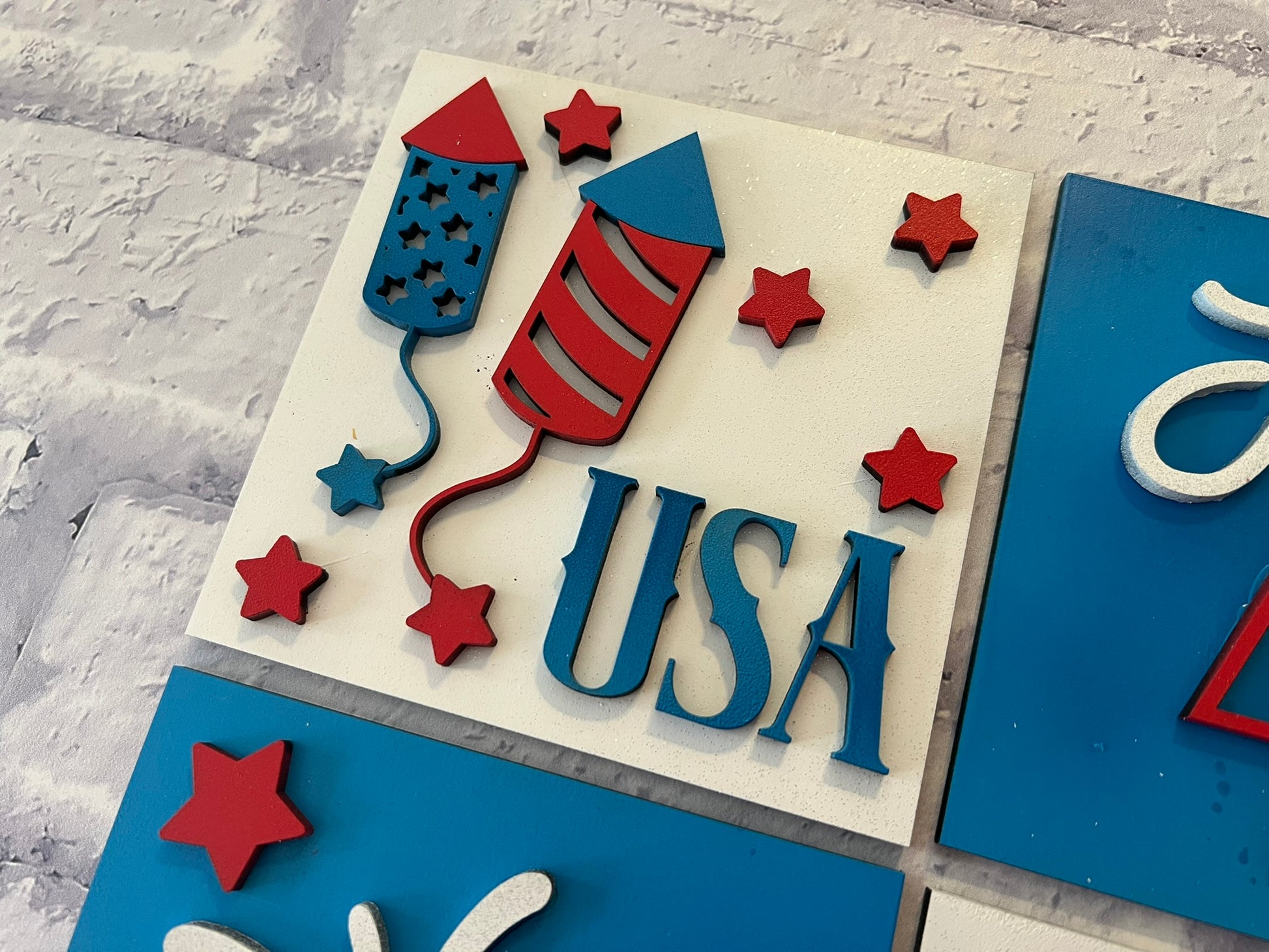 Boho style meets patriotic flair! Decorate your interchangeable sign holder with this fun and festive 4th of July tile set.