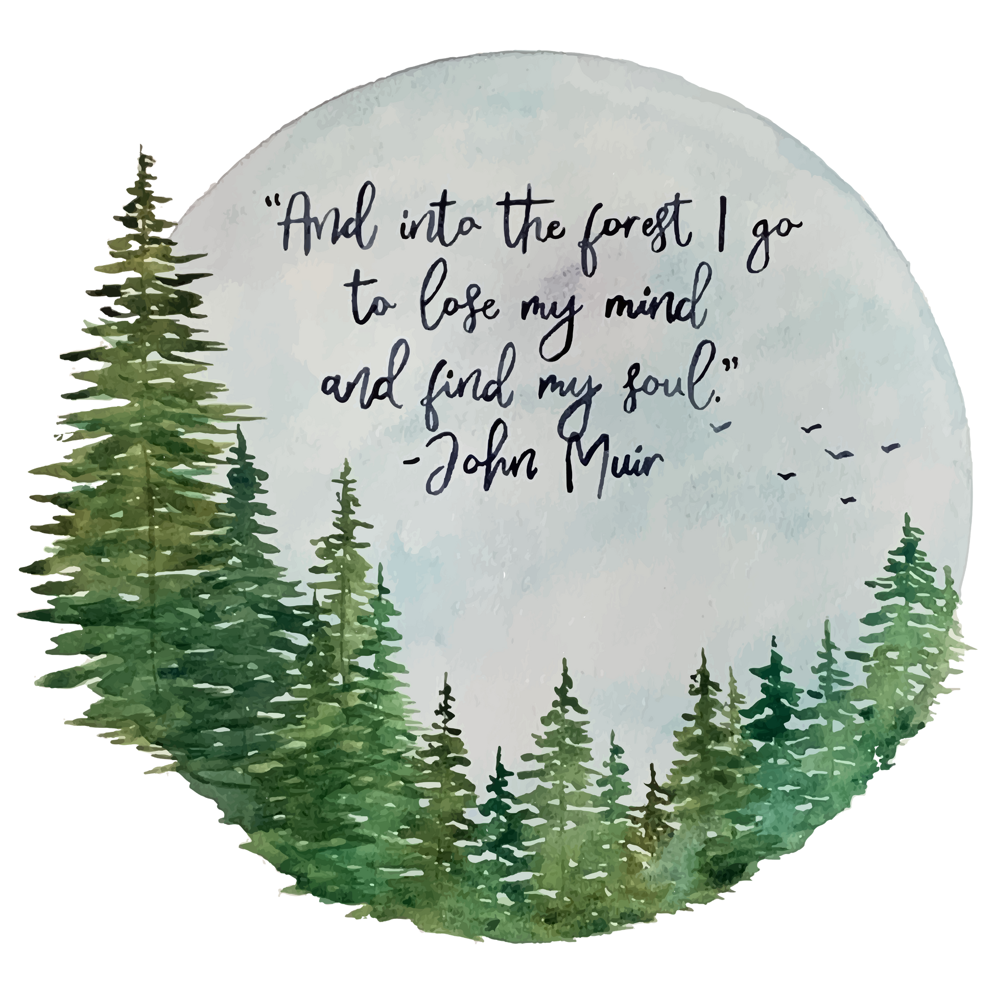Original artwork hand painted by Jodie Hand. This painting features a watercolor landscape in vertical format. The original artwork features a watercolor design of a circle surrounded with pine trees and the quote from John Muir "Into the forest I go to lose my mind and find my soul"