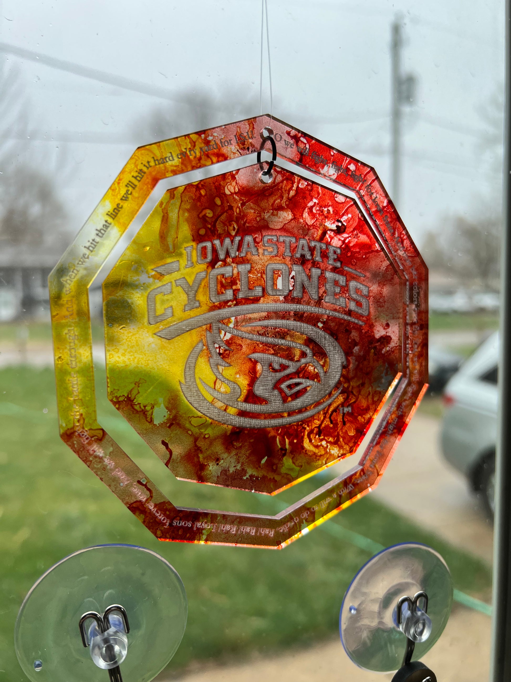 This Iowa State Suncatcher is a real eye-catcher! It's a delicate polygon-shaped acrylic cutout, colored and ‘cycloned’ up with alcohol ink and engraved with the iconic Iowa State logo and fight song. Get one for your Cyclones fan for a graduation present and watch it 'catch the sun' over their home, job, or alma mater! Go Cyclones!
