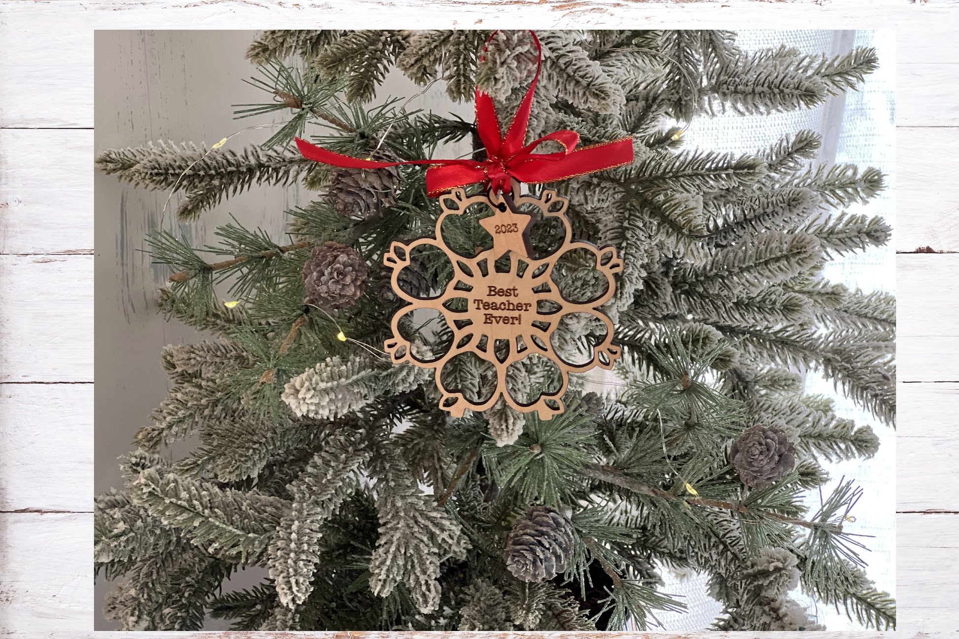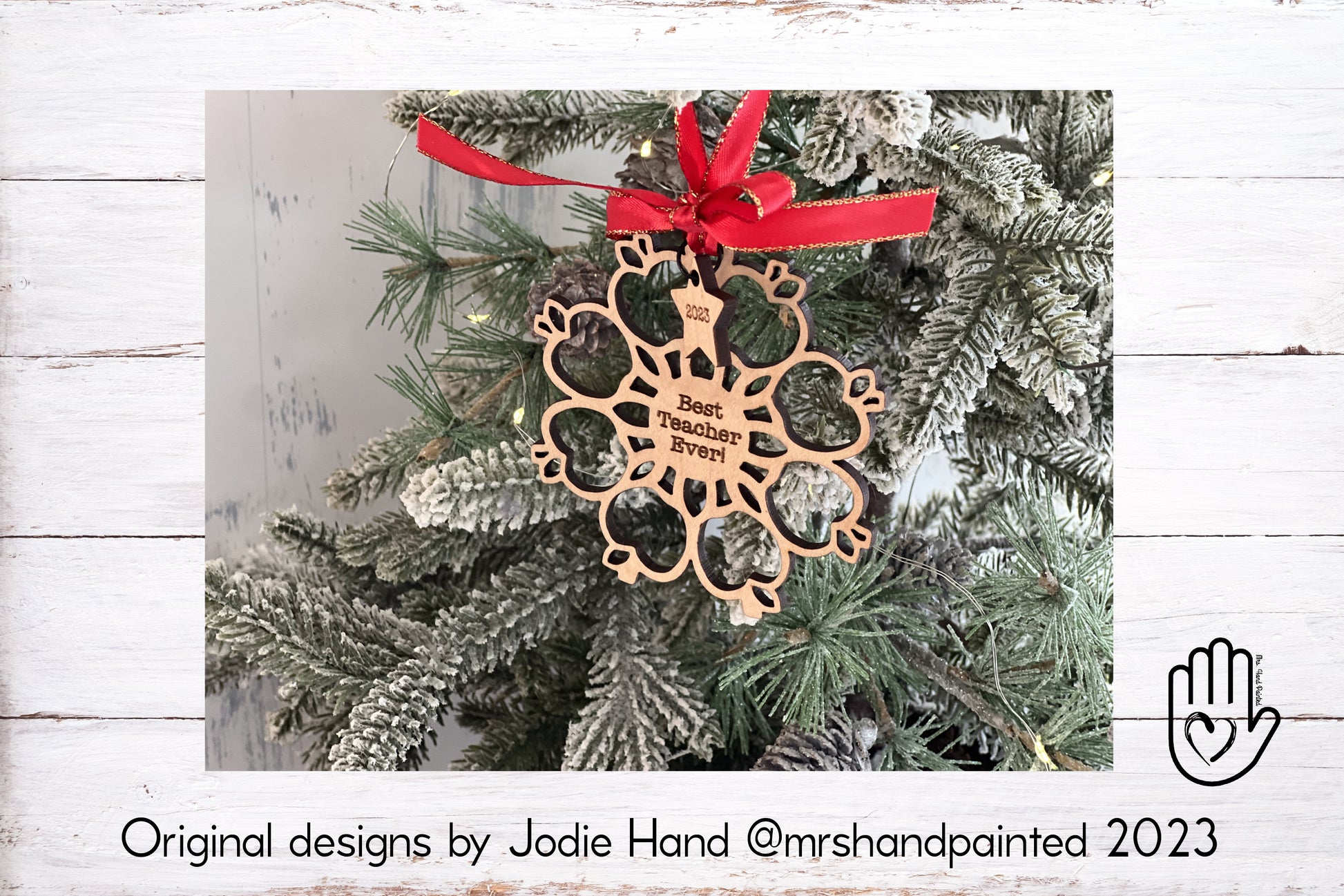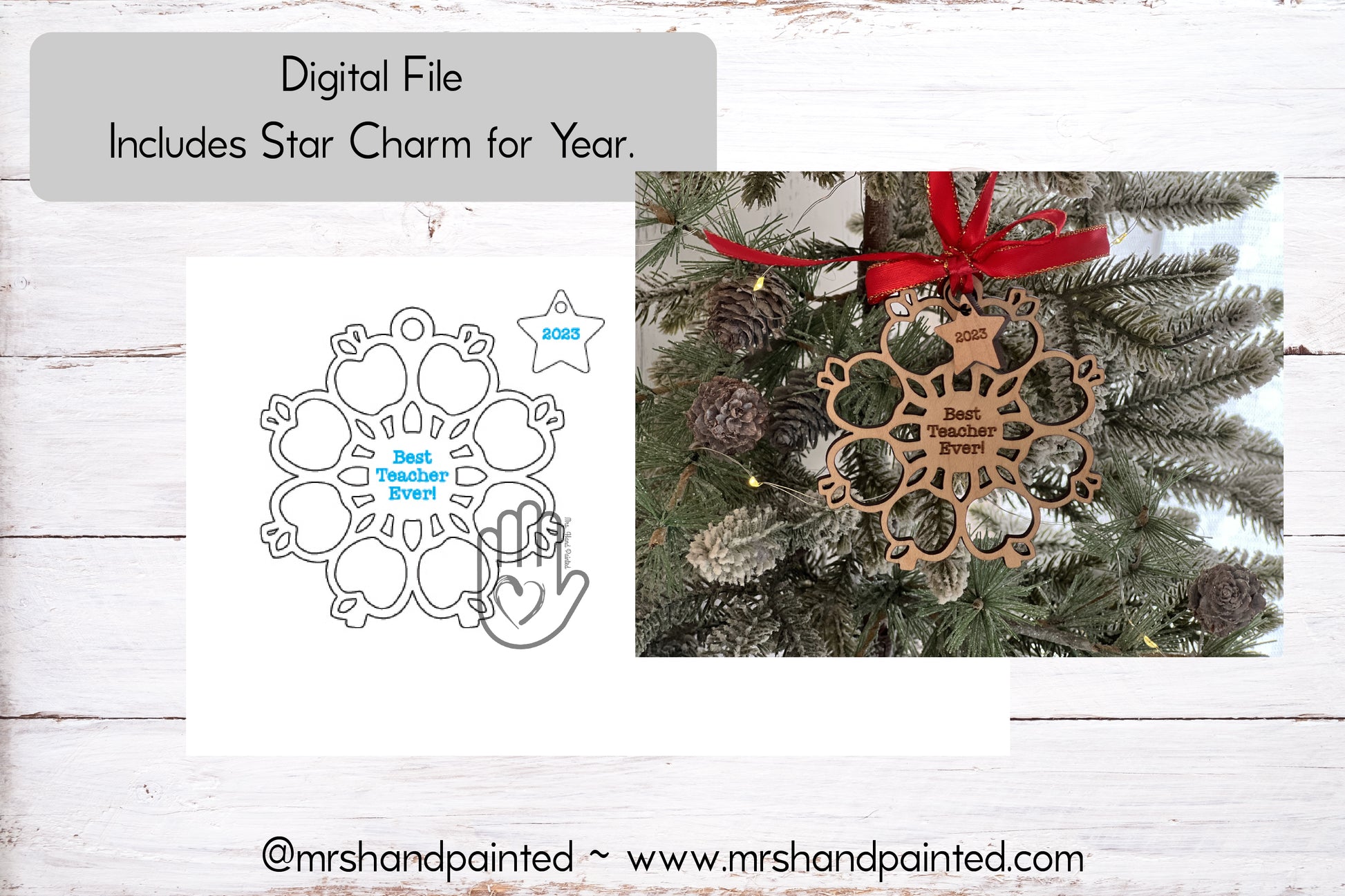 If you are looking for a unique ornament to cut with your cutting machine, I designed a fun apple themed snowflake design. I created this snowflake design on my Ipad in Procreate. You can customize the ornament by scaling it up or down. It is currently sized at 3.5 inches. The font I used is called "Farmland" and I included the year 2023 in the file on a star charm. You can customize your design by adding the teacher's name etc. to your file to engrave. The cut file was converted and rendered in Adobe Illustrator.