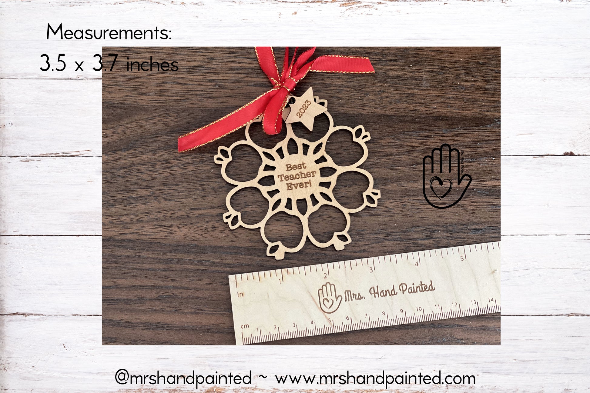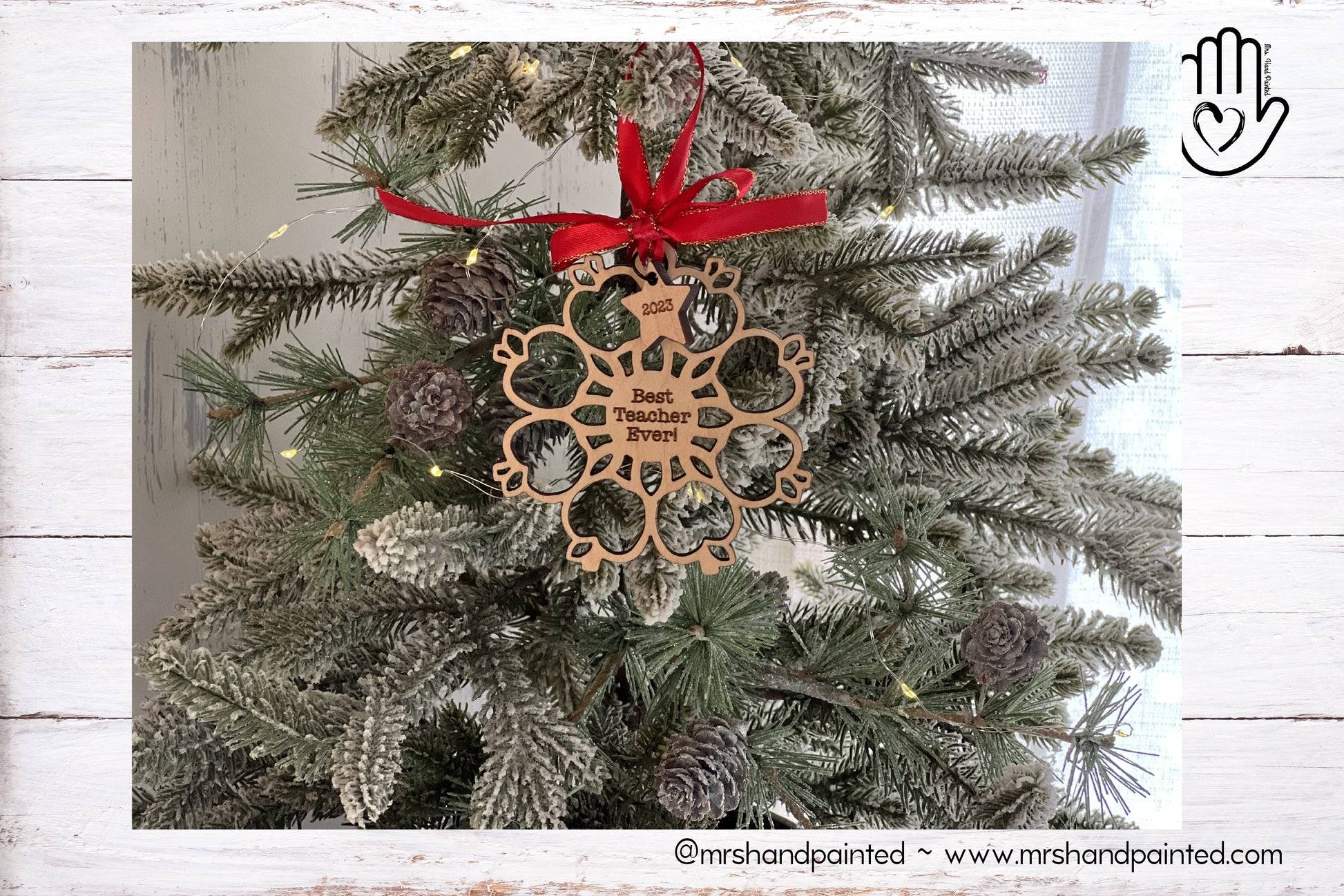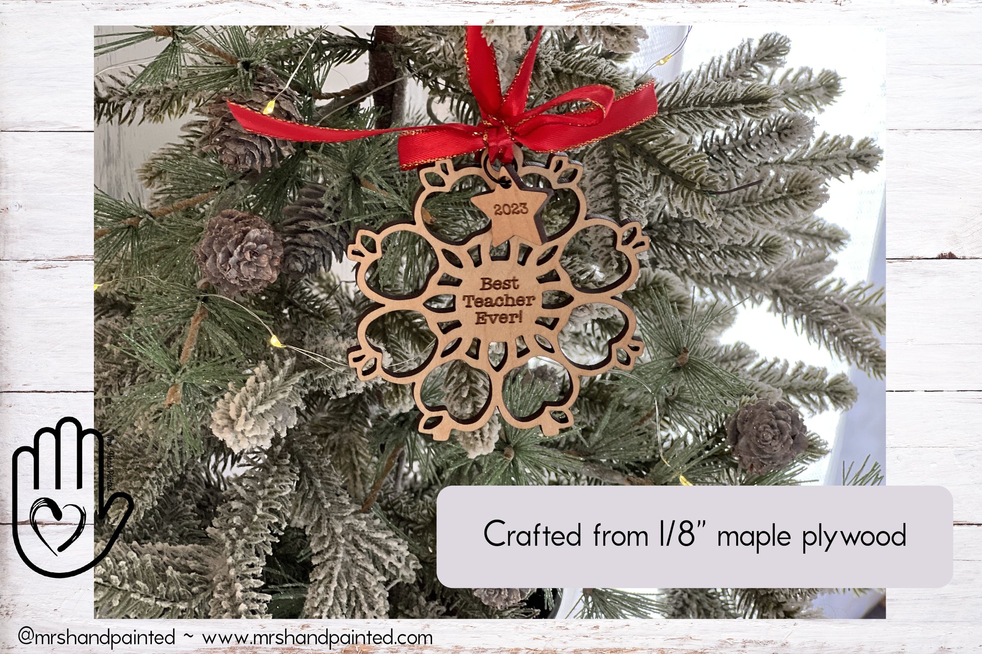 If you are looking for a unique ornament to cut with your cutting machine, I designed a fun apple themed snowflake design. I created this snowflake design on my Ipad in Procreate. You can customize the ornament by scaling it up or down. It is currently sized at 3.5 inches. The font I used is called "Farmland" and I included the year 2023 in the file on a star charm. You can customize your design by adding the teacher's name etc. to your file to engrave. The cut file was converted and rendered in Adobe Illustrator.