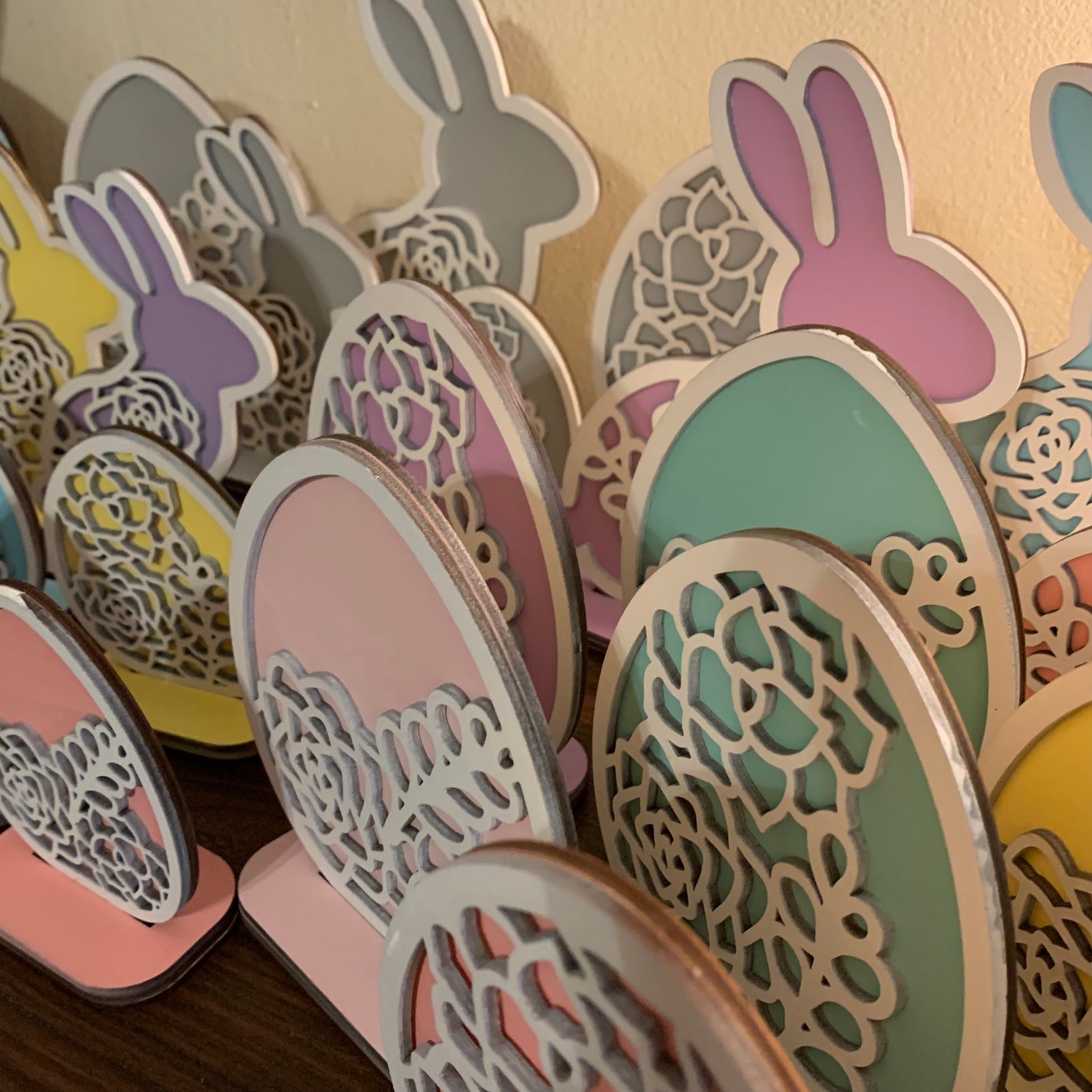 1 Bunny and 2 Easter Eggs designs with hand drawn succulent elements. Each piece comes in two sizes - Bunny 6 inch, Eggs 4 inch height and Bunny 8 inch and eggs 6 inch height. There is a 3 piece slotted base to assemble to make the pieces free standing. You may need to make minor adjustments to the slot cut out for your material. It is currently sized for 1/8" material, but you could adjust the bases to accommodate other thicknesses of material.