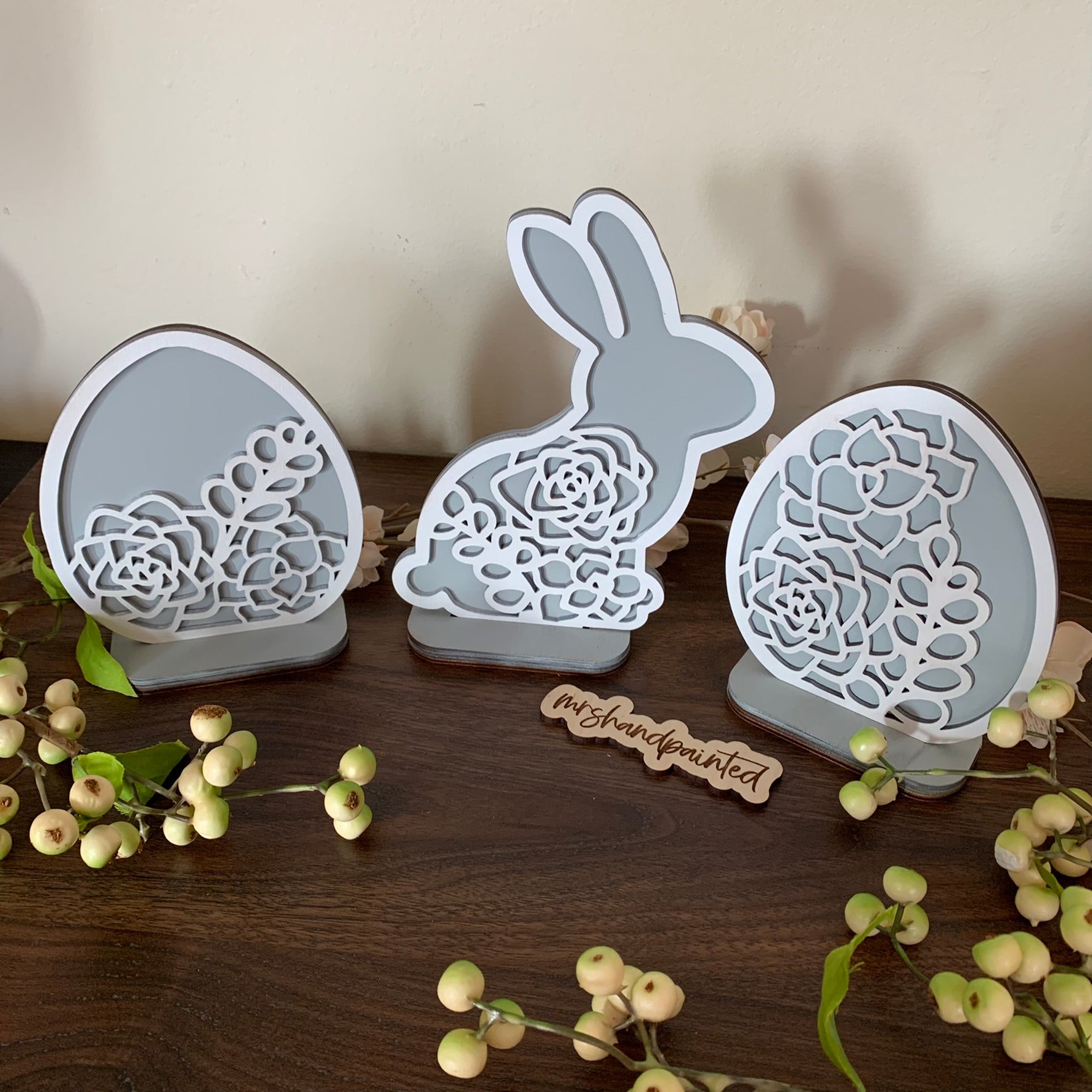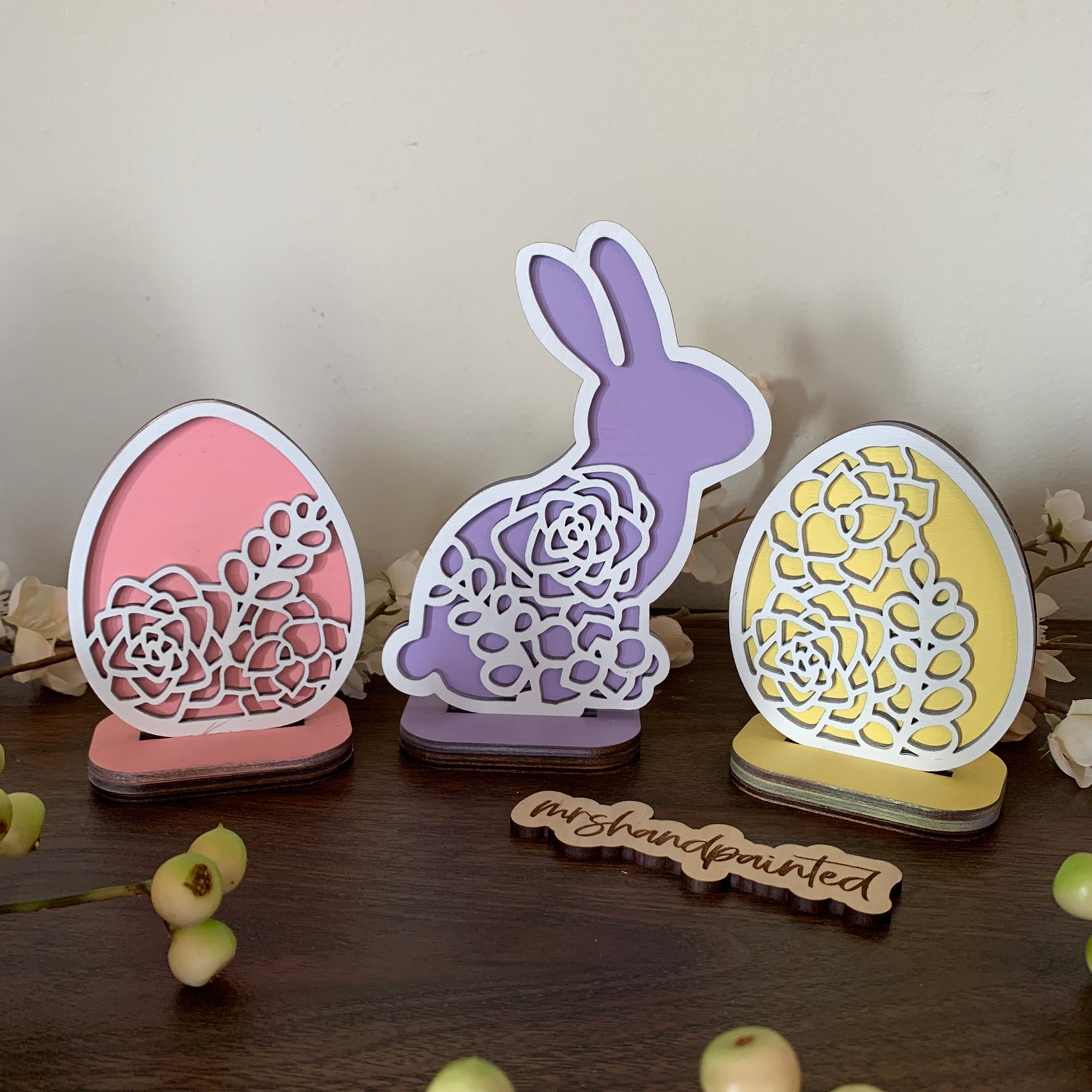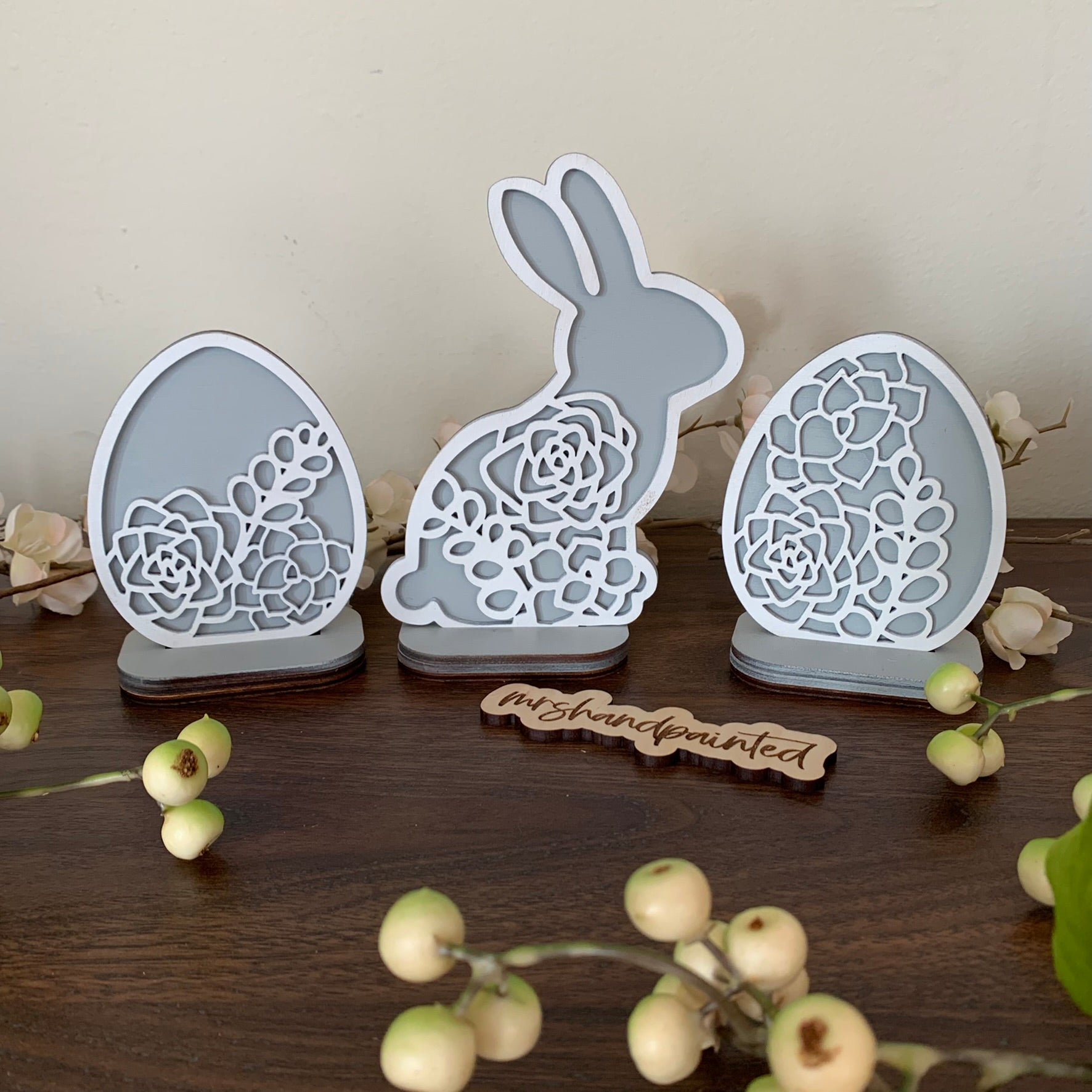 Layered Laser Cut Succulent Motif Easter Bunny and Eggs - Standing Shelf Sitter