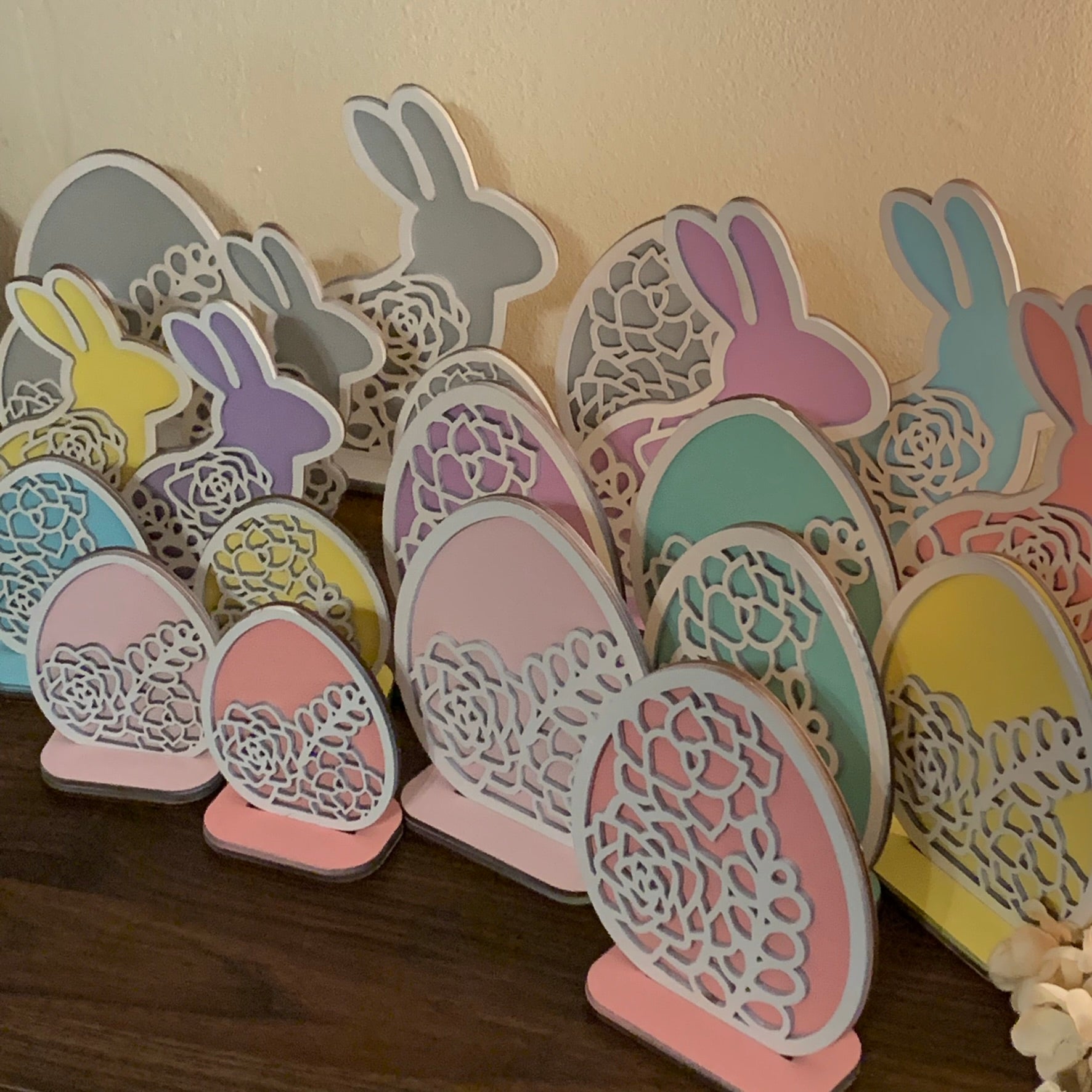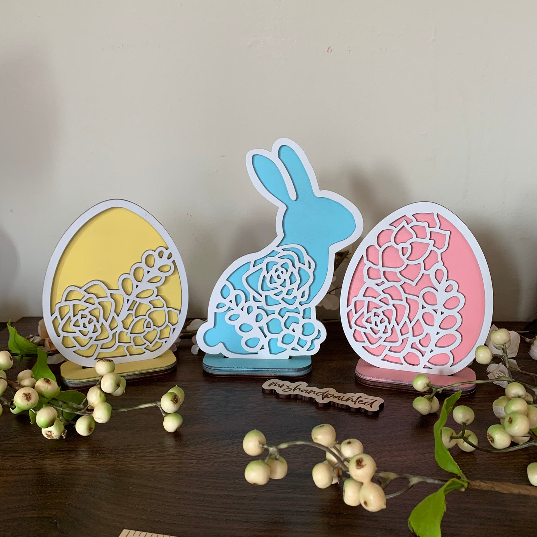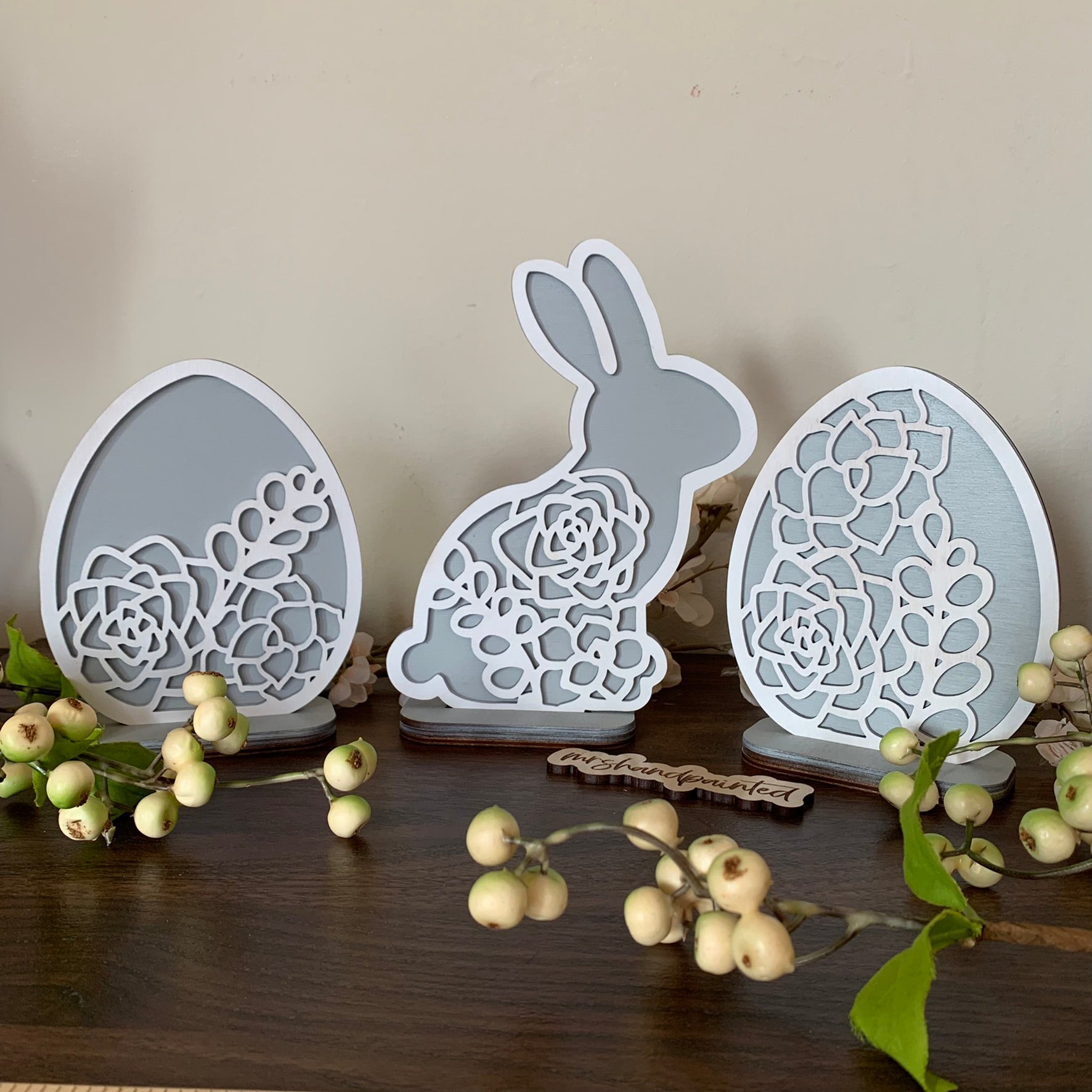 Layered Laser Cut Succulent Motif Easter Bunny and Eggs - Standing Shelf Sitter