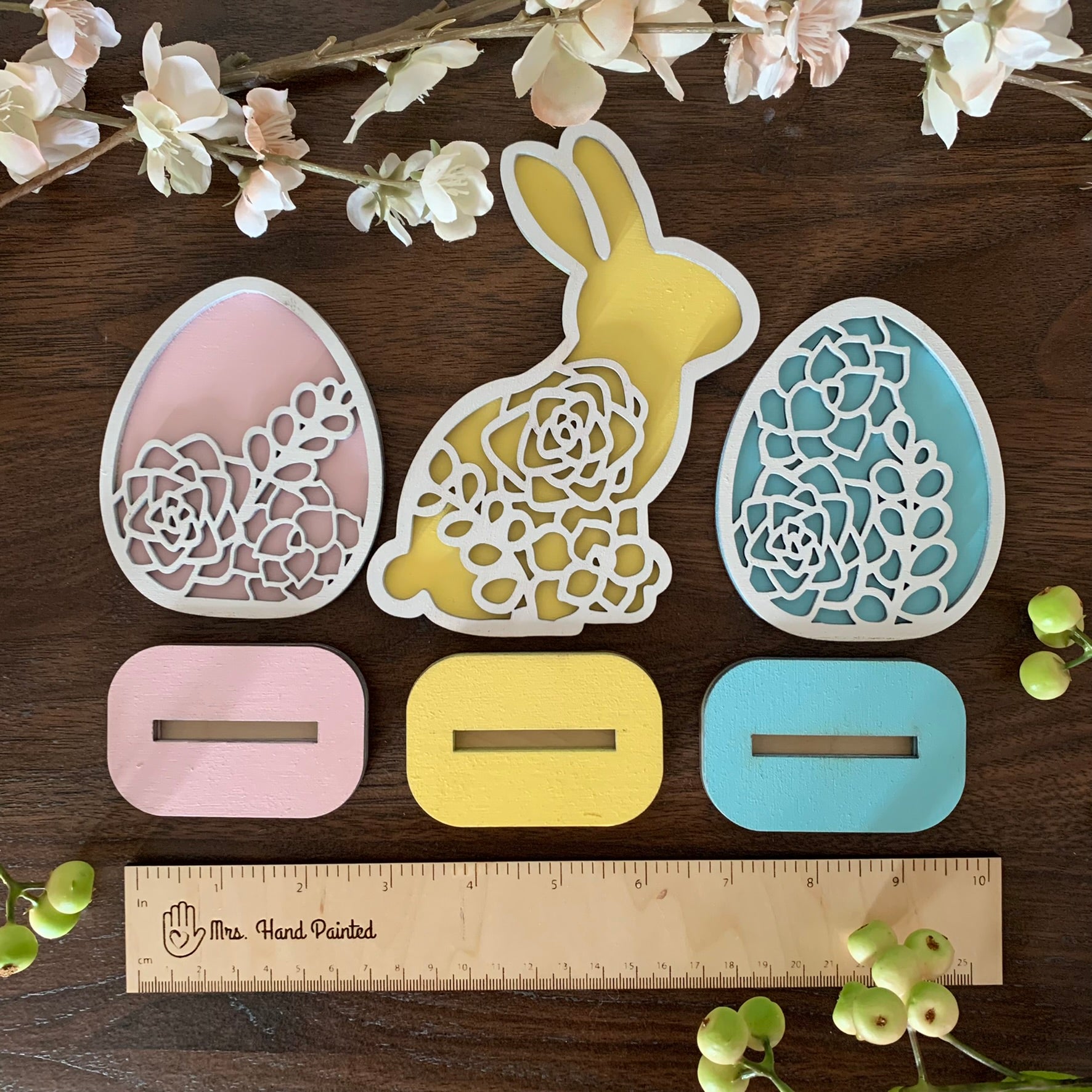 Hand drawn succulent motif inside a bunny or egg shape. 3 different designs in each set, will include 1 bunny and 2 different egg designs. Each piece includes a slotted base which can be removed for easy storage! Choose your colors and size of decorations. Please specify your color selections in the personalization box.