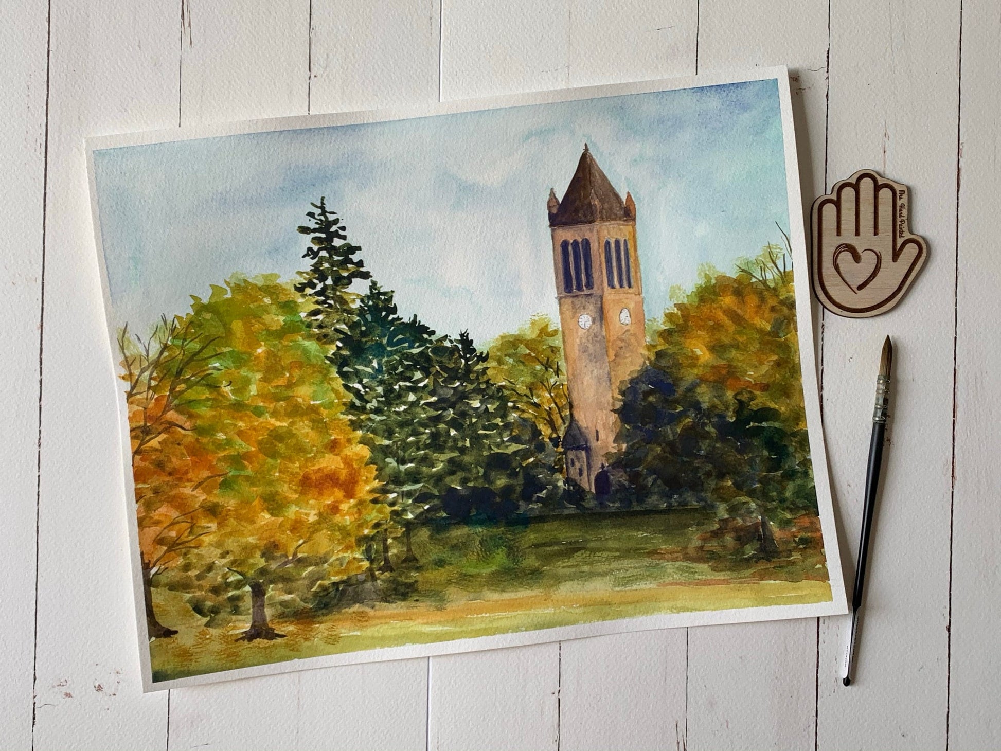 This listing is for an original watercolor artwork of the Iowa State campanile surround by trees in early fall, in an impressionistic style. This piece was painted on 100% cotton watercolor cold pressed paper with professional grade watercolor paints. Size of the artwork is 11x14 inches. Prints of this design are also available in my shop as well as digital downloads. Your original watercolor artwork will be shipped flat in a right mailer with backing board and wrapped in a protective plastic sleeve.