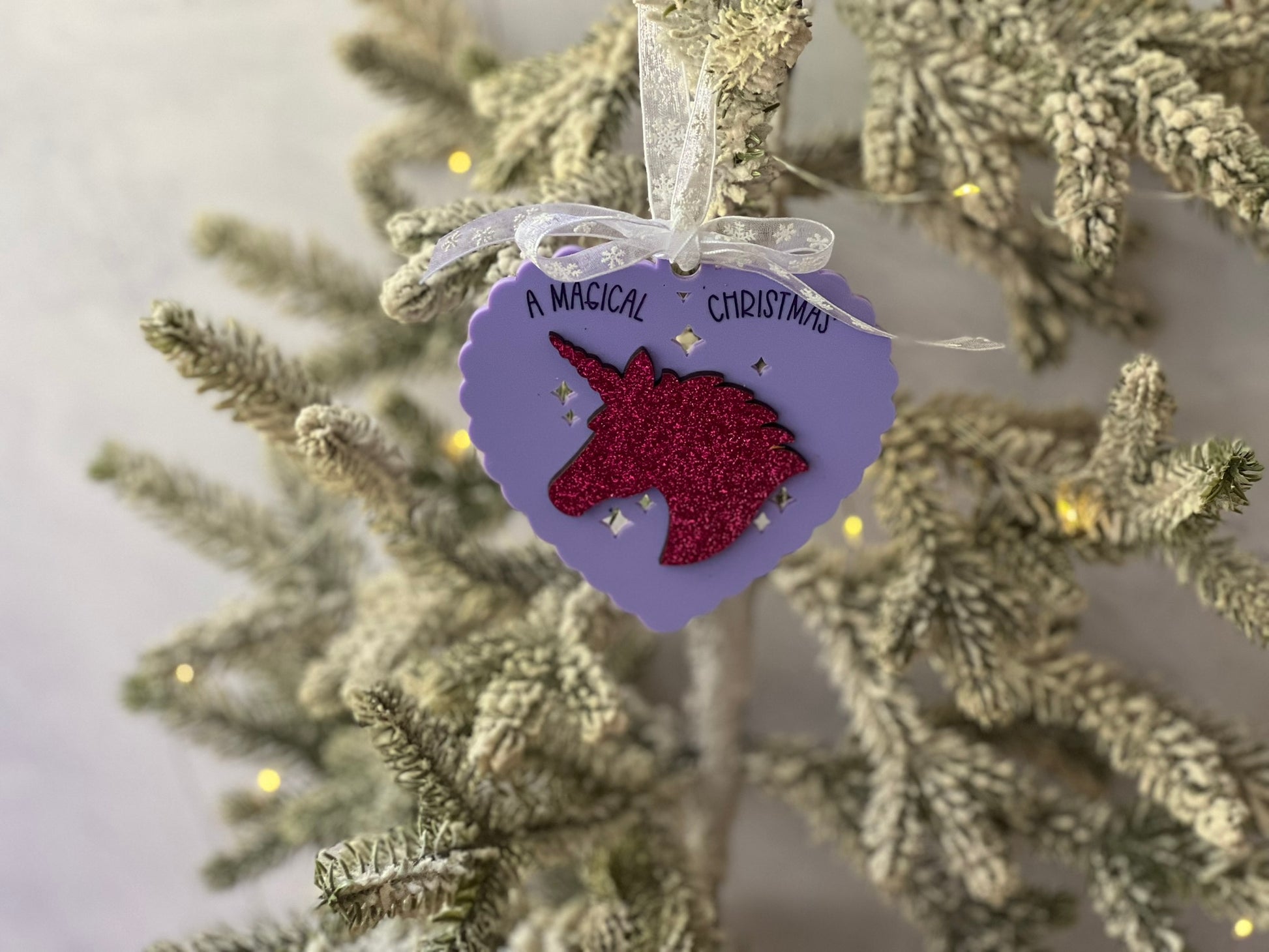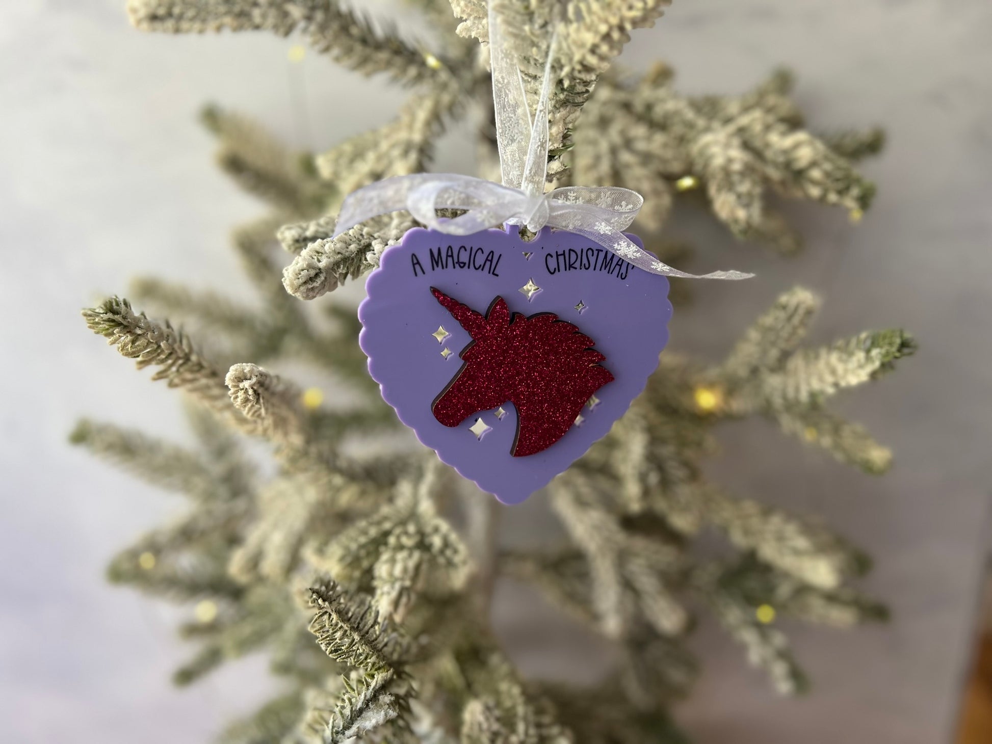Glam hot pink glitter wood with a cut out unicorn silhouette and layered on a lilac acrylic decorative heart with starburst cutouts, engraved sentiment "A Magical Christmas". White organza ribbon hanger with embossed white snowflakes.