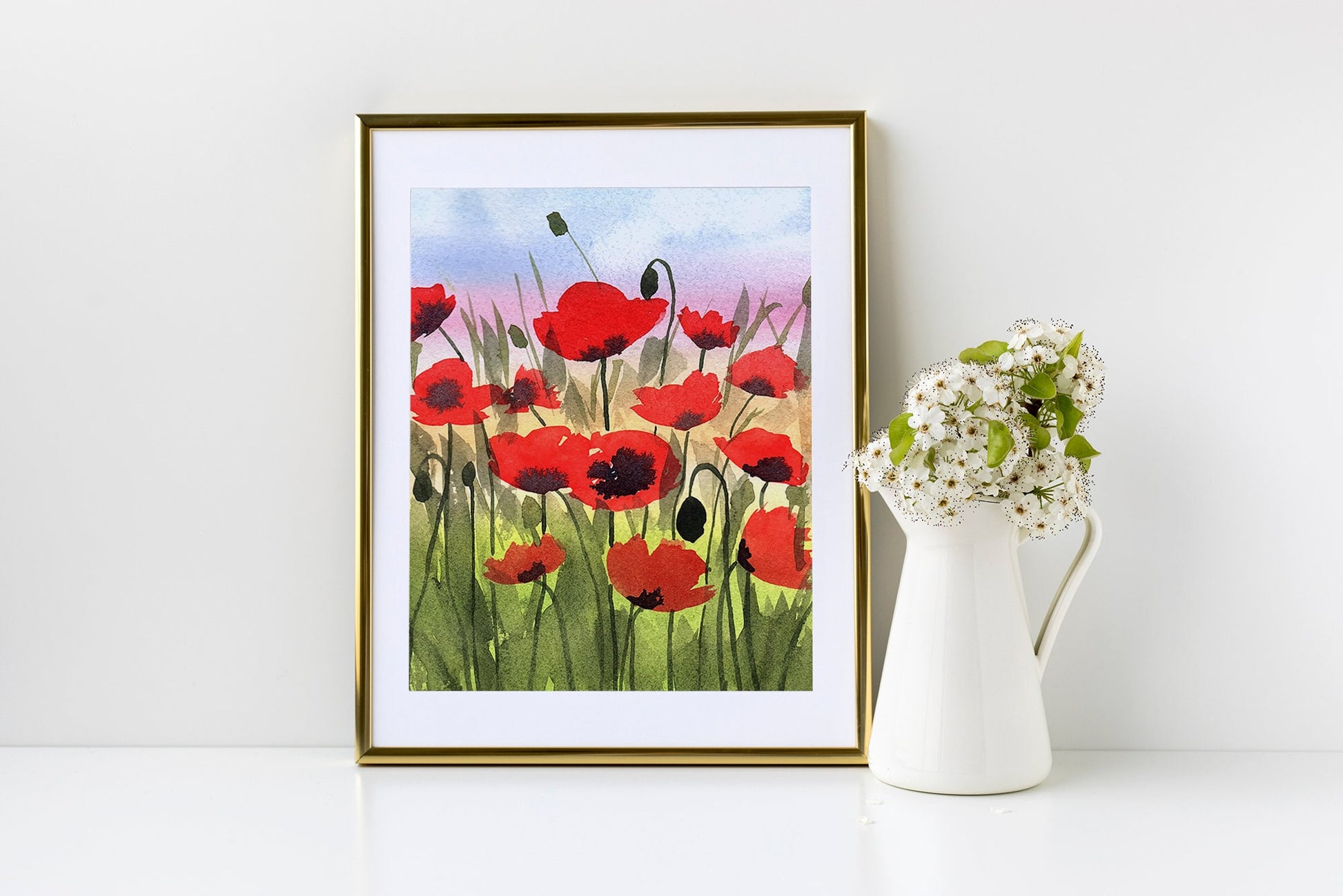 This original watercolor artwork was hand painted and digitized and available for instant download to print at home! "Poppies at Sunset" features a soft sunset background with bright red poppy flowers and green leaves. This is original artwork by Jodie Hand and was hand painted in watercolor.. It's a perfect living room wall art piece and is also available to purchase as a digital print in my shop as well as puzzles!