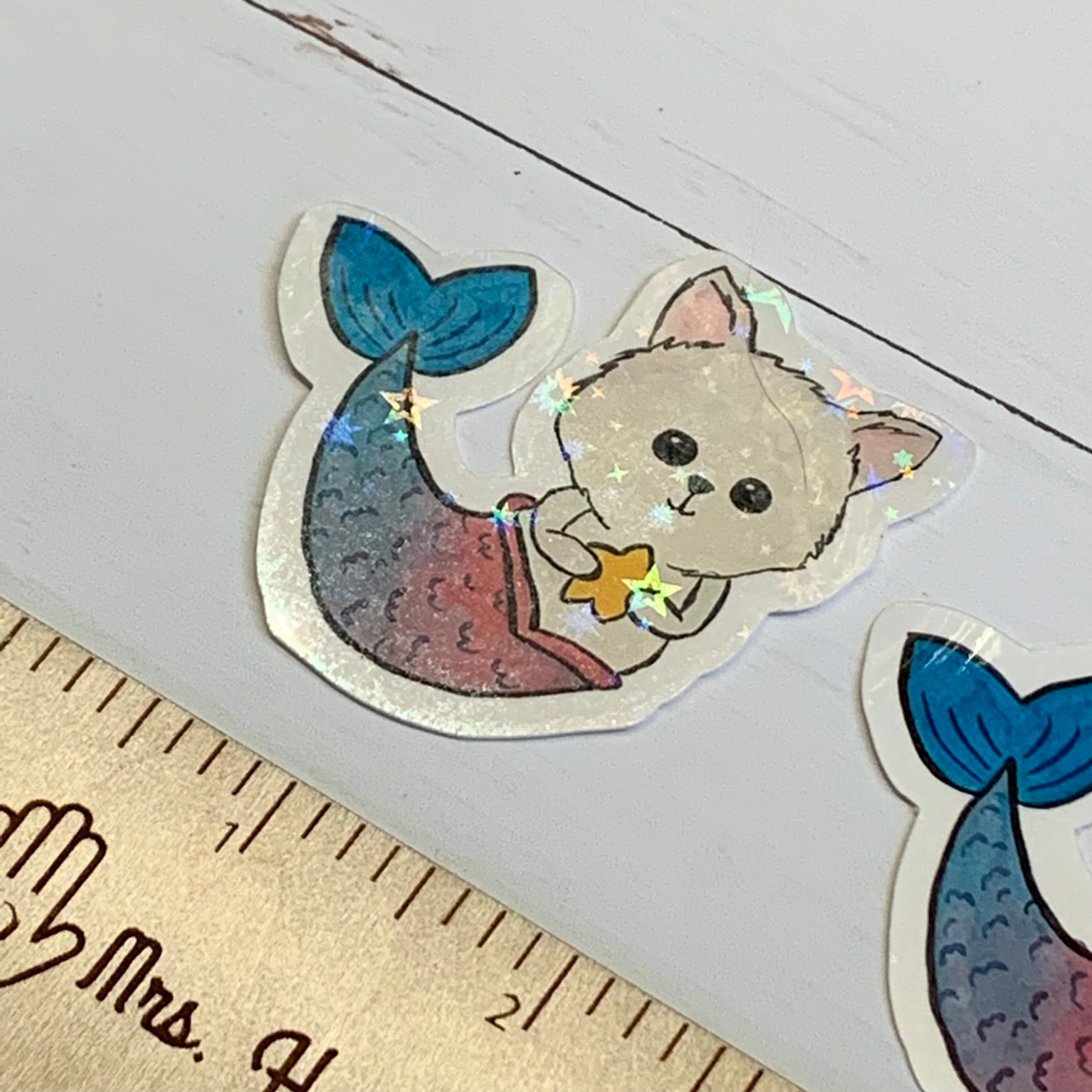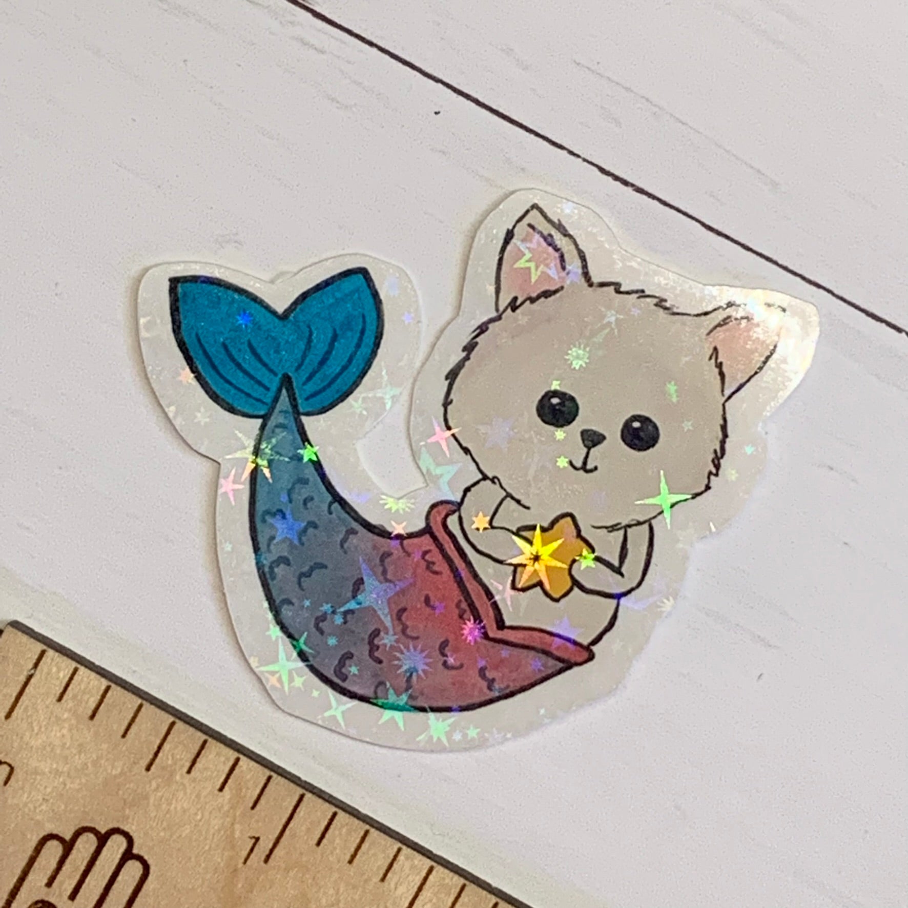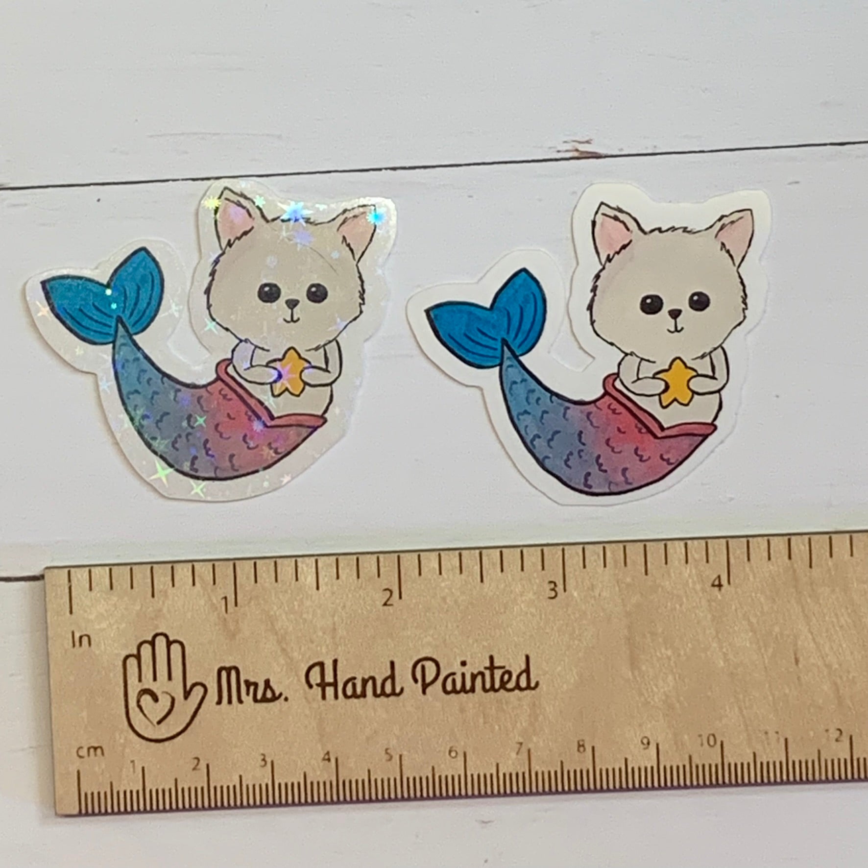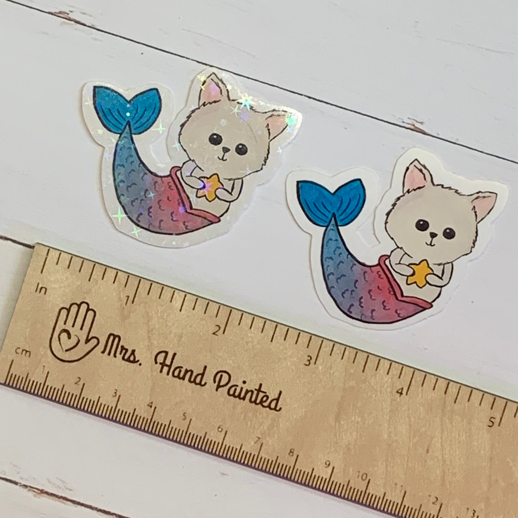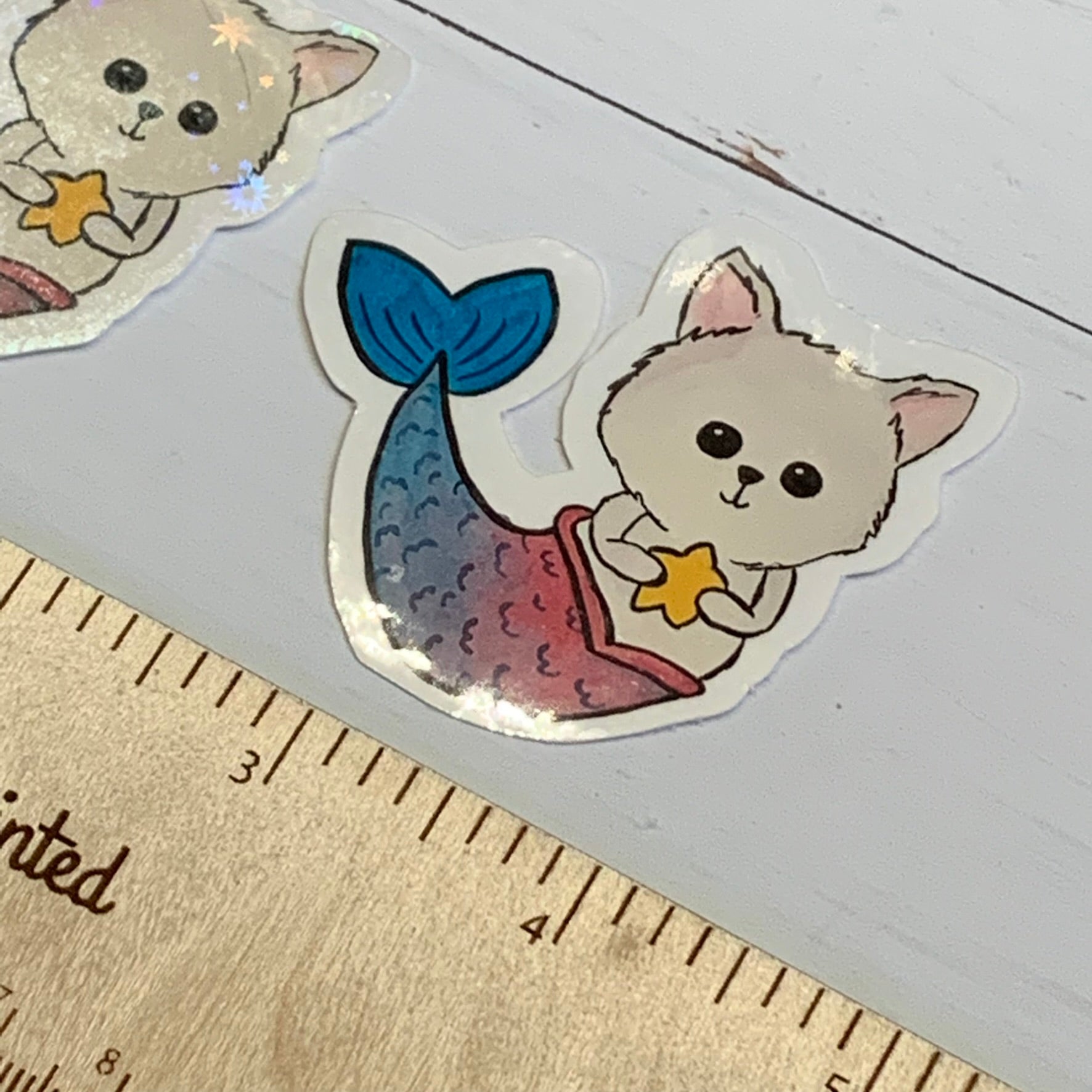 These vinyl die cut stickers are perfect for decorating your devices or gear! The original artwork features a mermaid kitty original artwork painted in watercolor. There is 1 size available and is sold as single stickers. Choose glossy vinyl finish or holographic overlay finish.