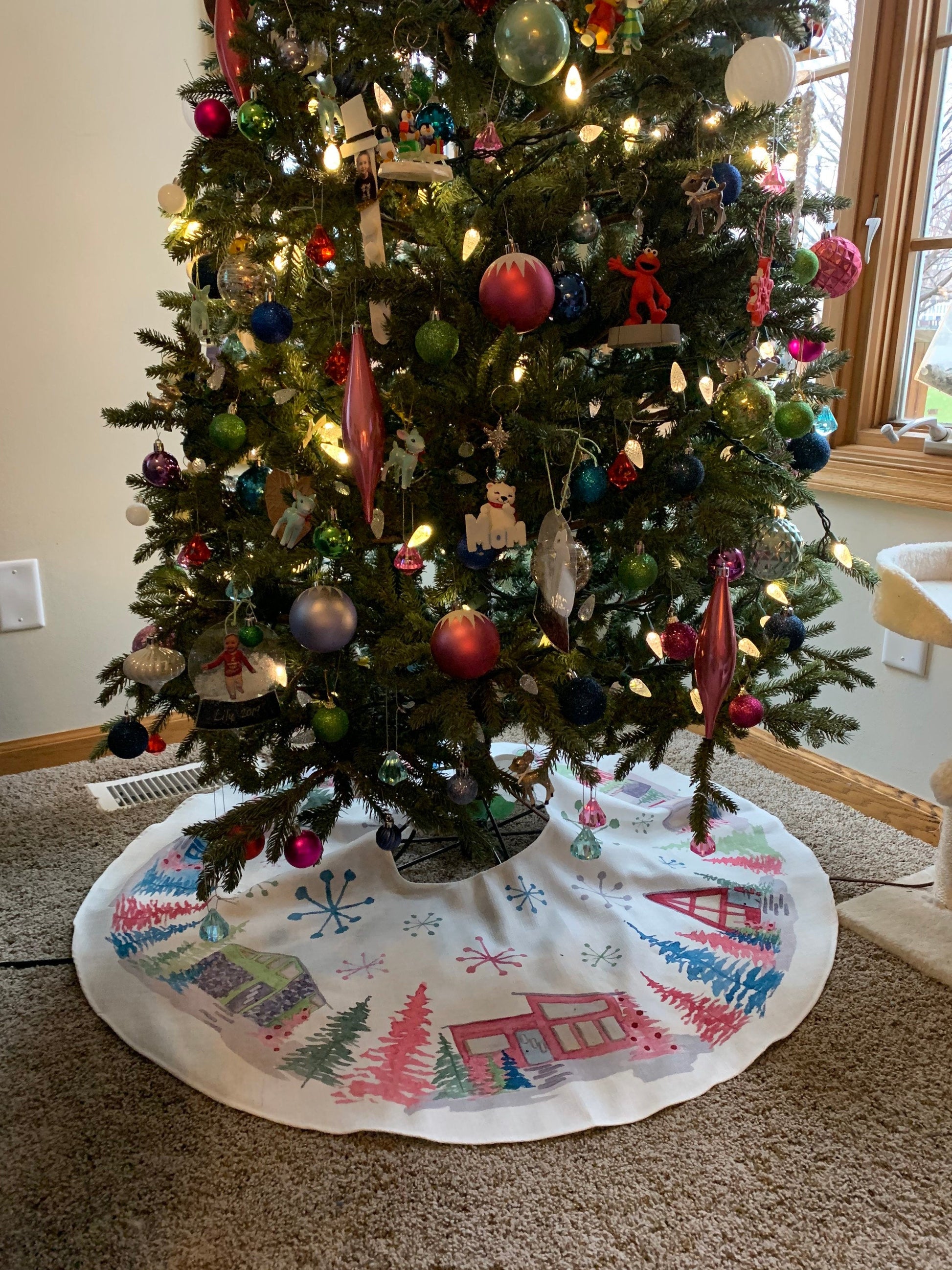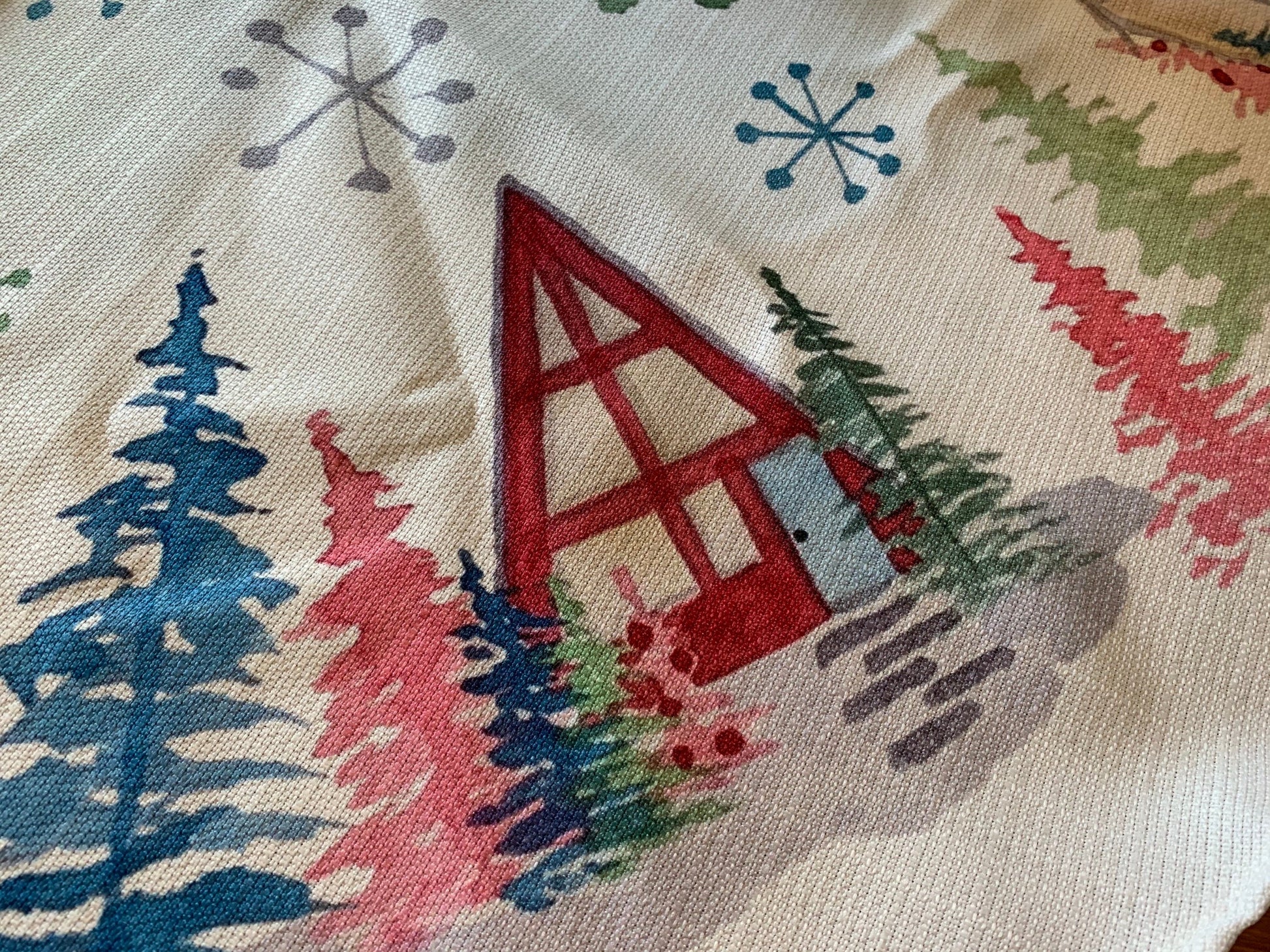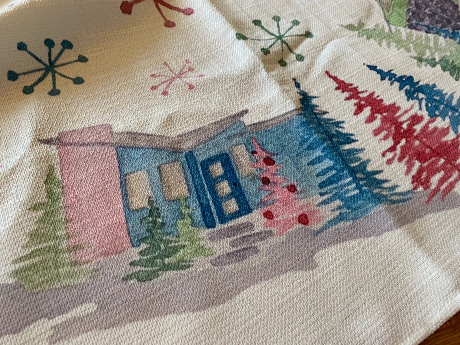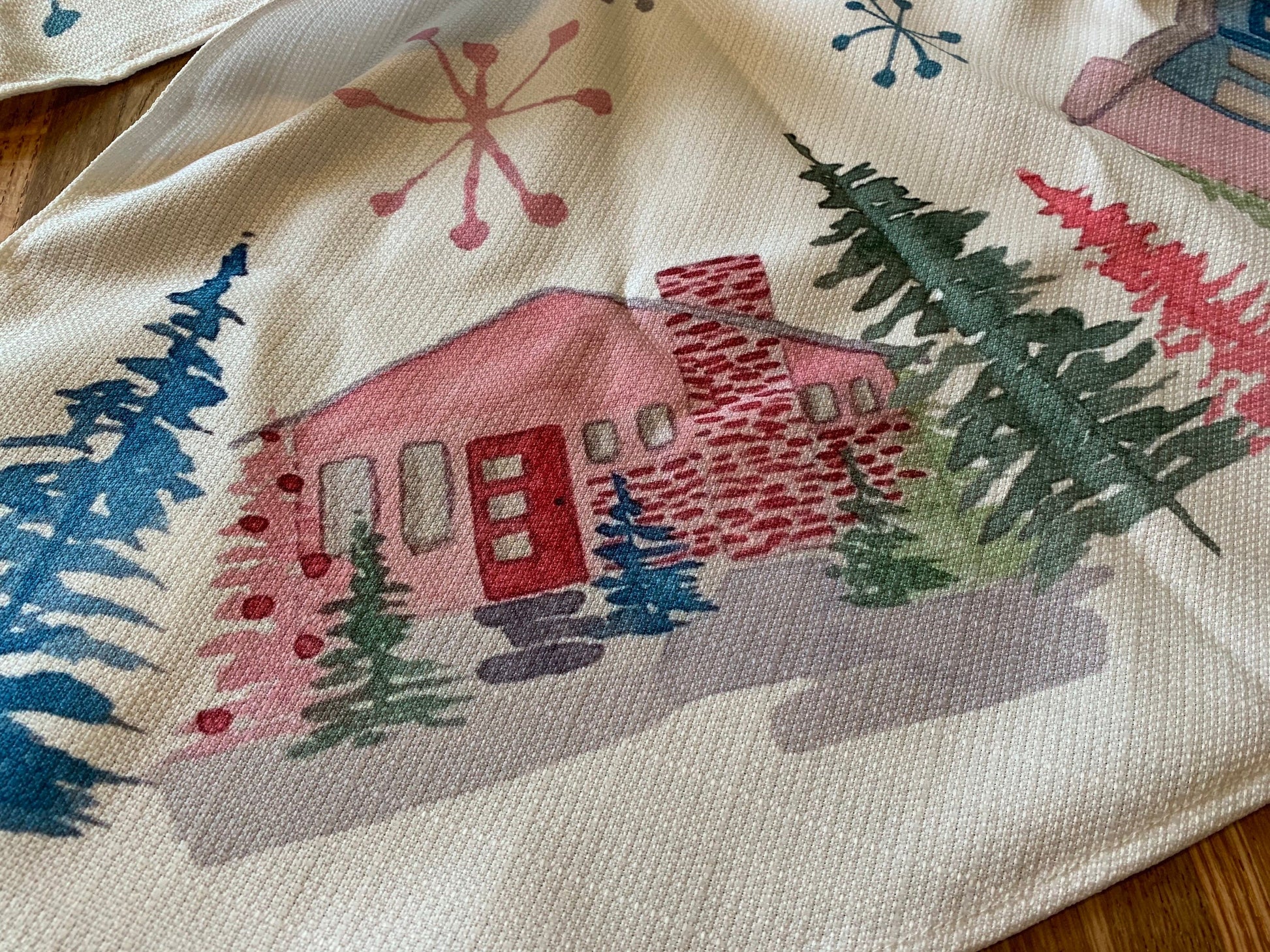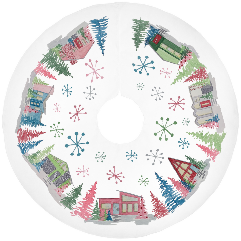 This tree skirt features hand painted watercolor images of retro putz houses surrounded by trees and snowflakes! White background. Coordinating home textiles for all rooms of your house available too! See below for more information about my collection! Retro Themed Christmas Collection