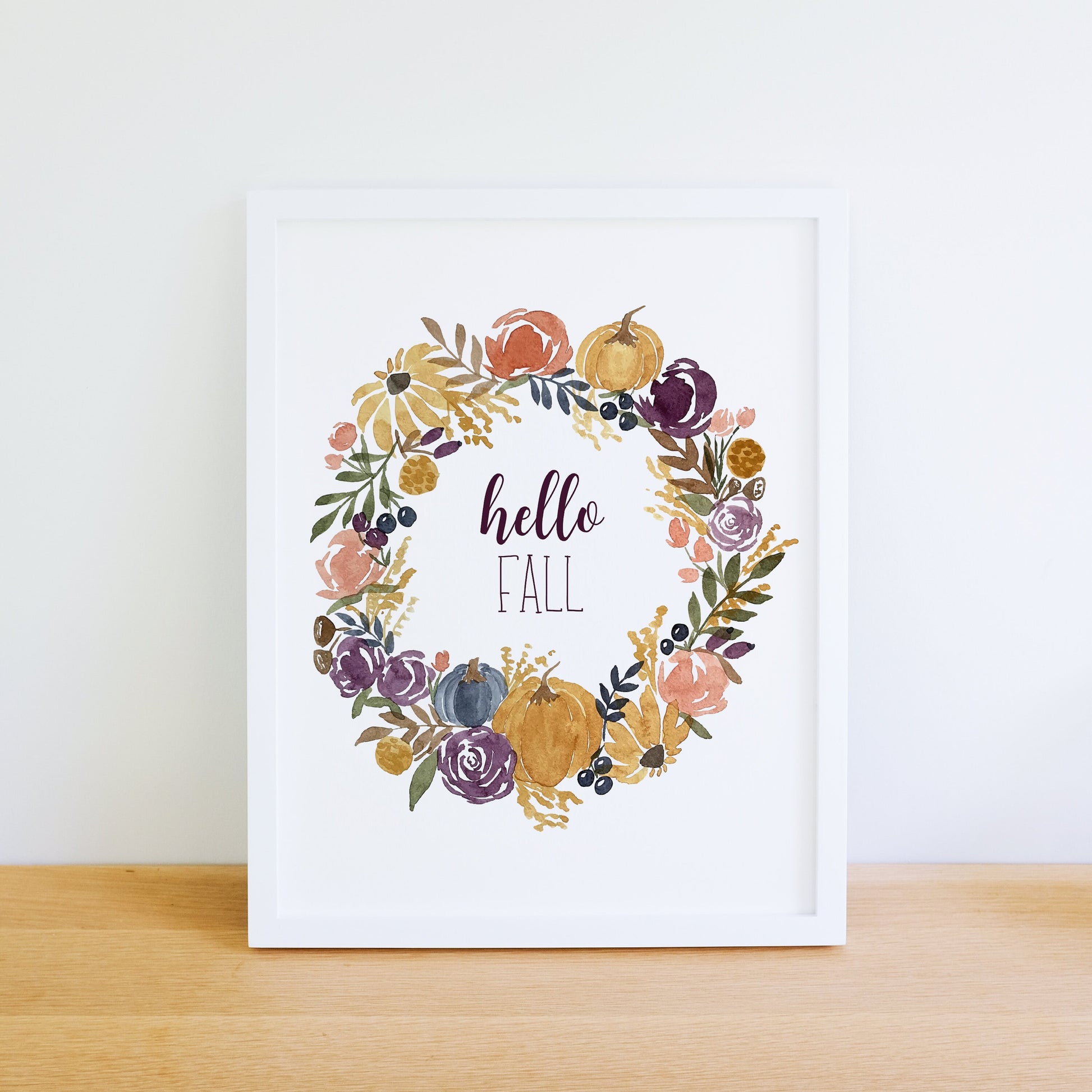 Watercolor floral wreath design was hand painted and digitized to be printed at home! This design features a floral wreath design with burnt orange colored pumpkins, peach, plum and indigo colored flowers and accents with golden wheat and berries! You will receive two sets of files with this download. One set of 4 images with the sentiment "hello fall" in mixed font style and one set of 4 images with no sentiment included so you can choose to add one yourself if you desire. There will be 8 images total. 2 designs with 4 different size each. See below for sizes.