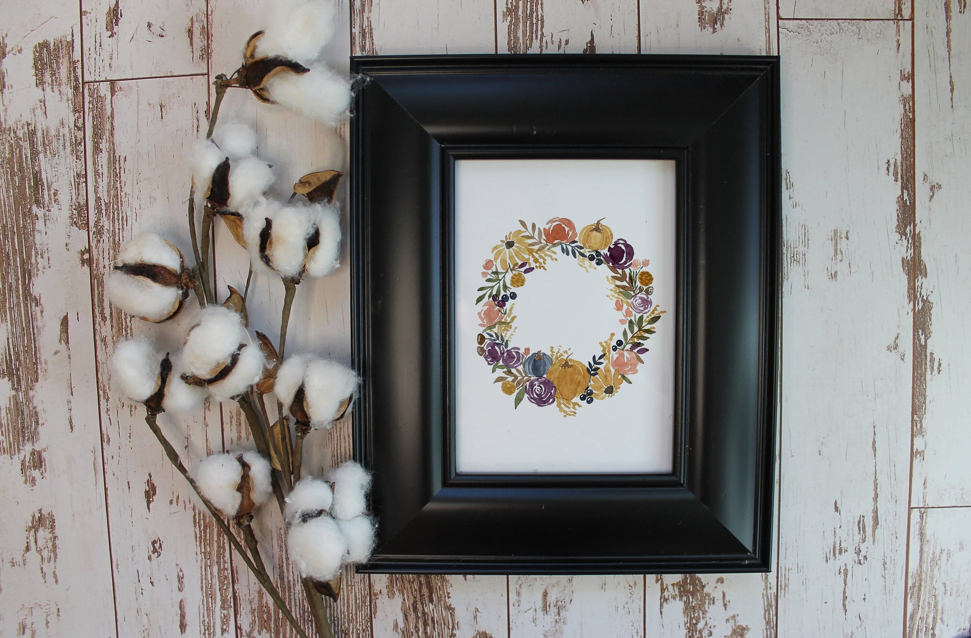Watercolor Fall Floral Wreath - Digital Download - Printable Artwork, Fine Art Print, Autumn Flowers and Pumpkins