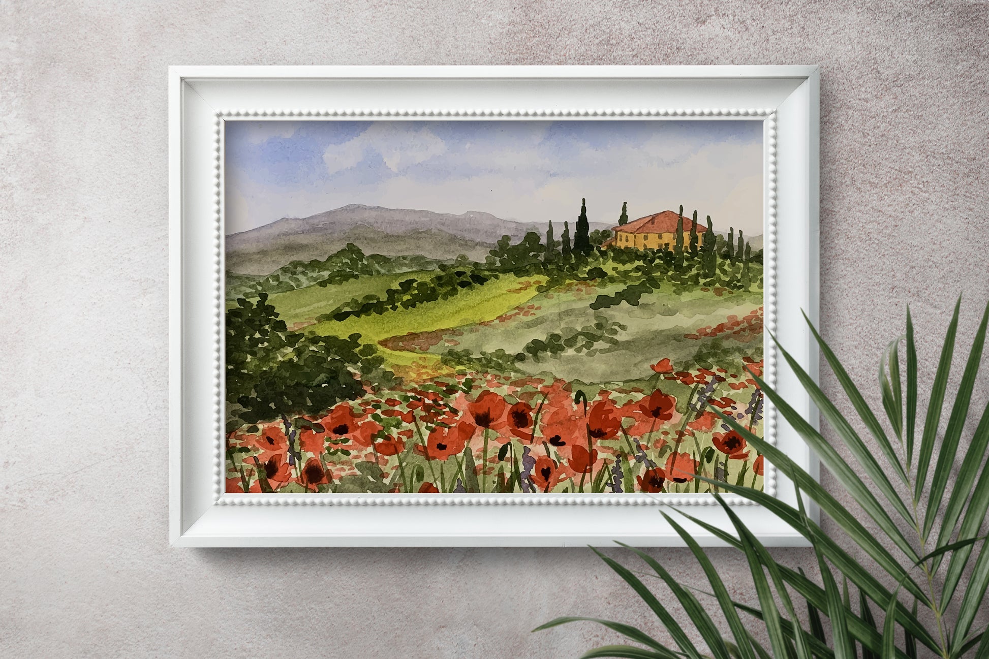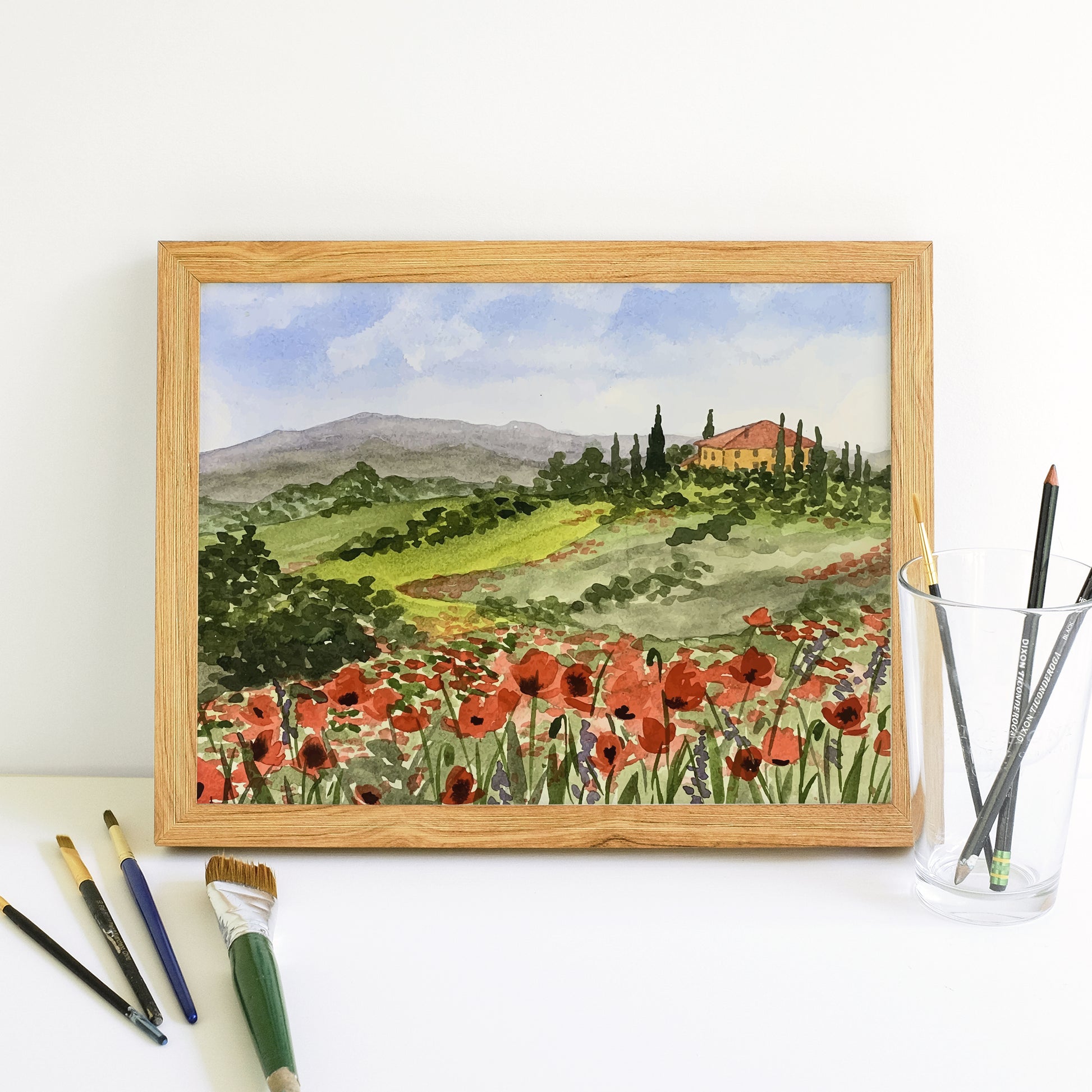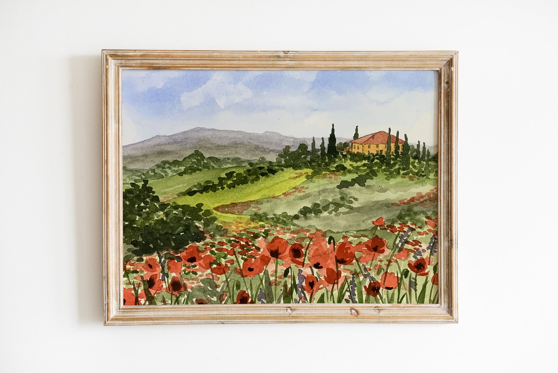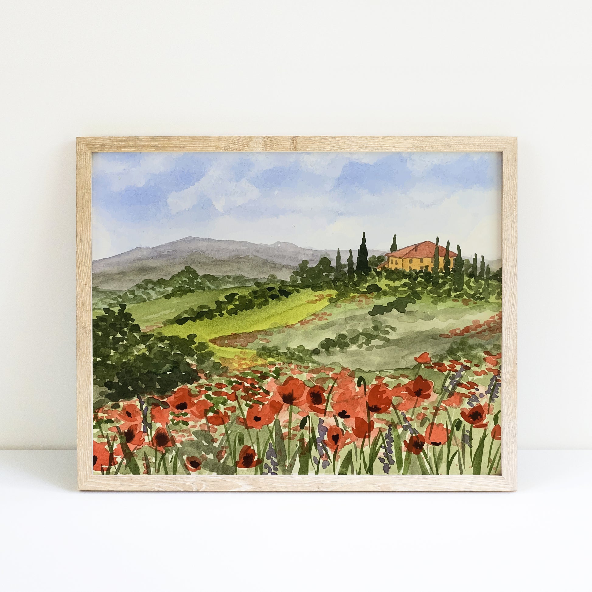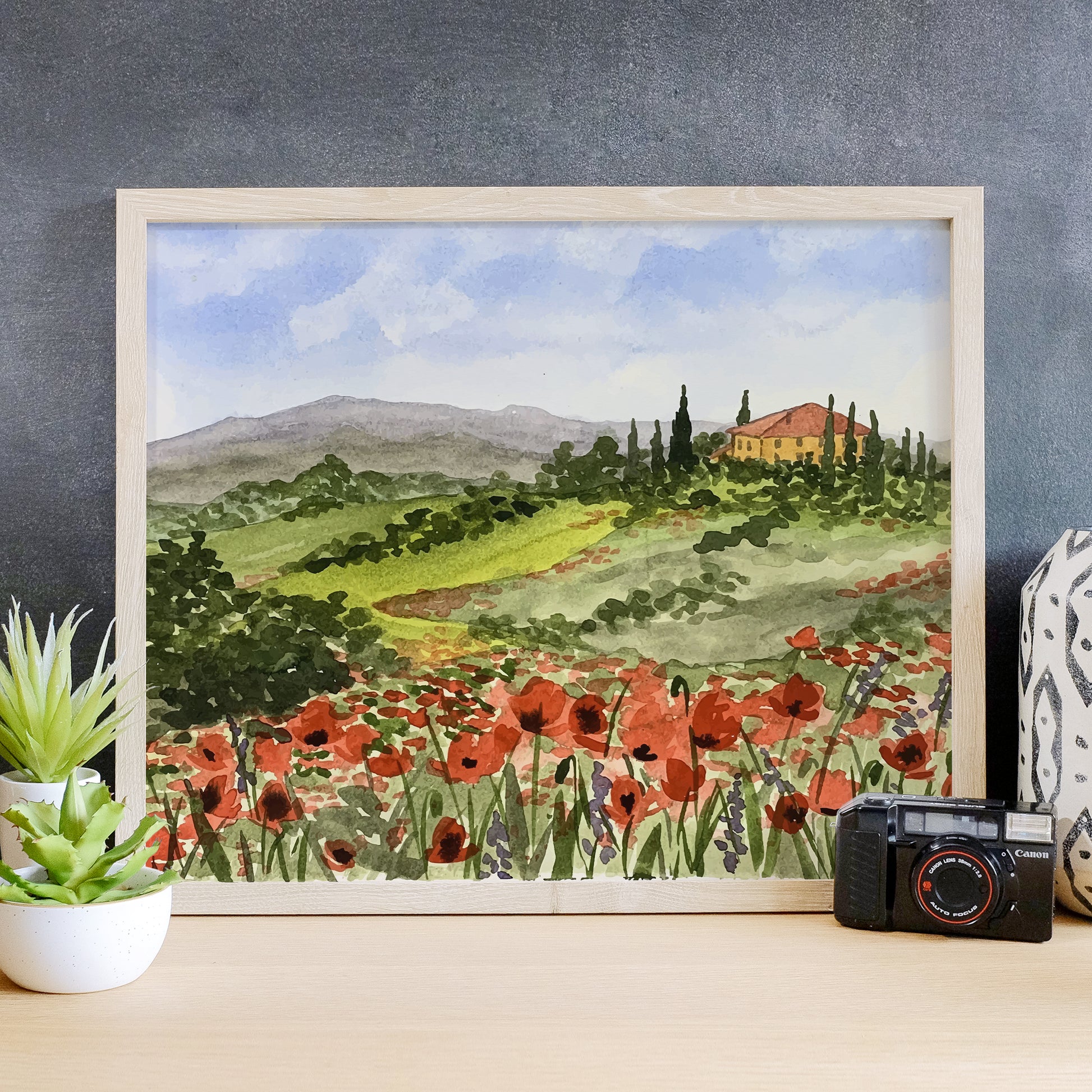 Watercolor fine art print reproduction of a Tuscan poppy field with home in the distance. This is original artwork by Jodie Hand and was hand painted in watercolor.