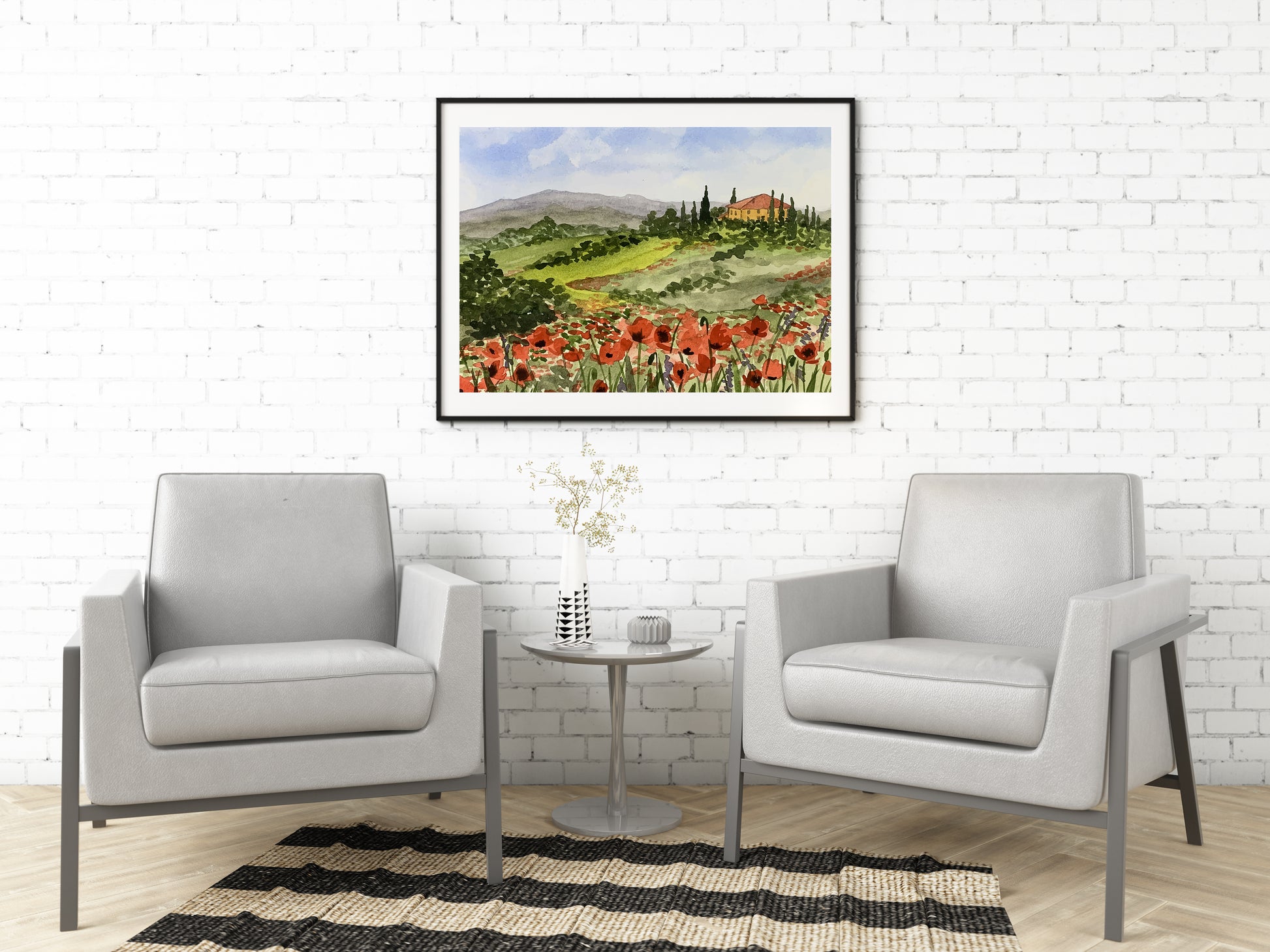 Watercolor Tuscan Poppies Landscape #2 Giclee Fine Art Print Reproduction