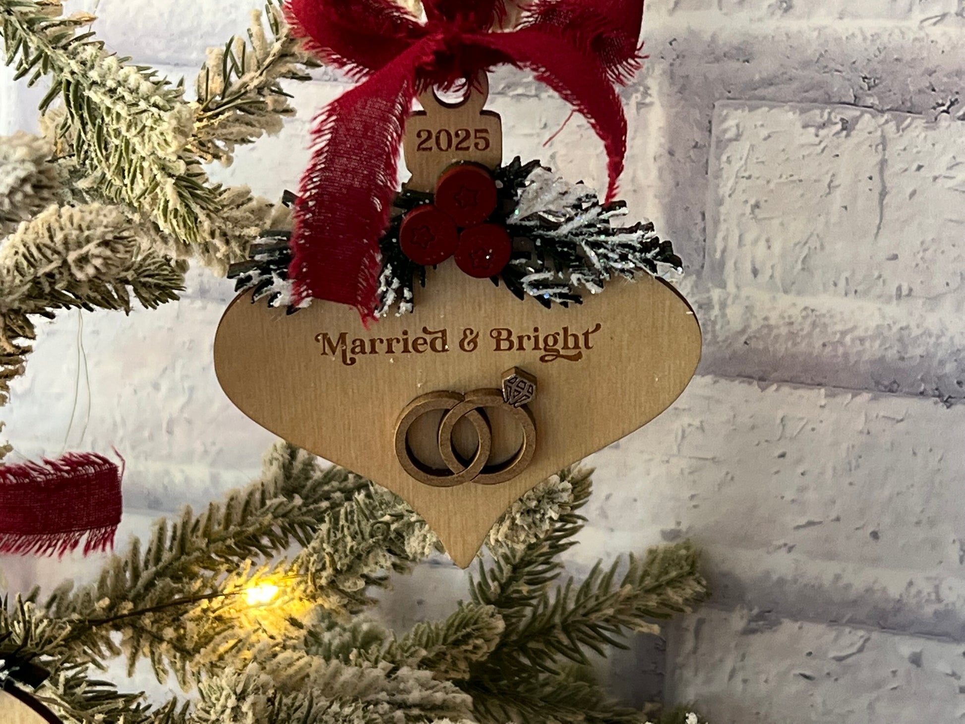 Celebrate your big year with these charming laser-cut birch ornaments! Choose between "Engaged" or "Married & Bright" sentiments, each adorned with delicate pine branch details and shimmering glitter snow accents. The festive red fabric ribbon makes hanging a breeze, while the 2025 date captures this special milestone forever. Perfect for newlyweds or as a thoughtful gift for the happy couple on your list!